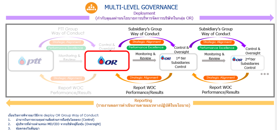 In order for OR’s business processes to operate efficiently, with transparency, and be auditable, OR has established group management guidelines or OR Group Way of Conduct to supervise OR and OR group to ensure that management is carried out according to the same standards. OR received the transmission of the PTT Group Way of Conduct management in a hierarchical governance format. OR also established a collection of guidelines, principles and work processes, which serve as a manual for companies in which OR holds shares to implement through OR representatives assigned to perform duties as directors, executives, and operators, and to evaluate effectiveness according to the OR Group Way of Conduct. OR requires these companies to report performance results back up in the same hierarchy. The Monitoring & Review Program is established to follow up on operations according to the policy and receive feedback in order to continually improve group management practices, in terms of efficiency and effectiveness. In addition, the Management Committee, such as the OR Group Management Committee (OR GMC) and various policy committees are required to regularly monitor the efficiency and effectiveness of operations as well.