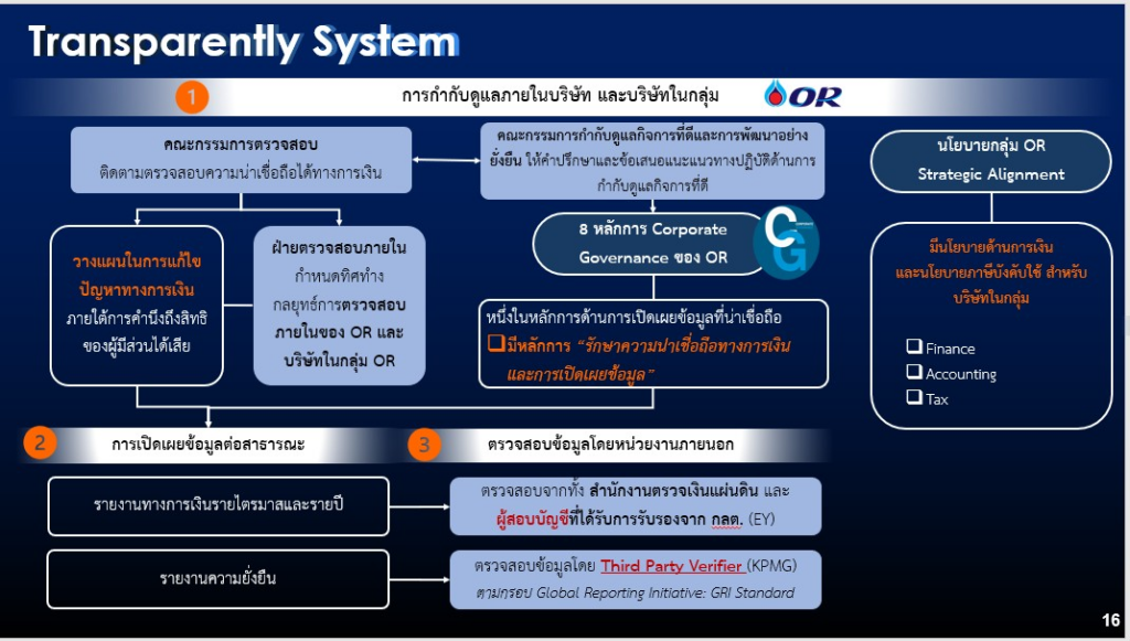 OR is managed in accordance with the principles of Corporate Governance to build confidence among all groups of OR stakeholders that there is a corporate governance system covering the entire group of companies, including overseas businesses, to create responsibility and transparency, as well as build the credibility of public data reporting that has been verified by external agencies qualified and experienced in various fields to ensure that information disclosed to the public is accurate and reliable. This includes financial reports that have been audited by the Office of the Auditor General of Thailand and auditors certified by the Securities and Exchange Commission (SEC). Furthermore, the operating results disclosed in the sustainability report have been audited by a third-party agency, in accordance with the Global Reporting Initiative Standard (GRI Standard), ensuring OR’s transparent and reliable management.