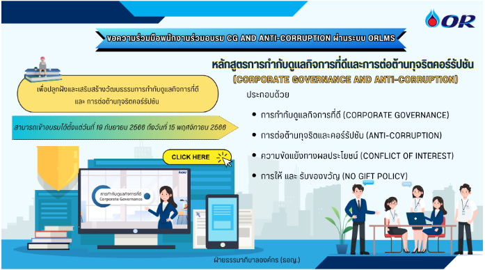 In addition, OR also organizes online training on the topic of CG and Anti-corruption through the OR LMS system. The contents include: Corporate Governance, Anti-corruption, Conflict of Interest, and No Gift Policy in order to cultivate and strengthen the culture of good corporate governance and anti-corruption.