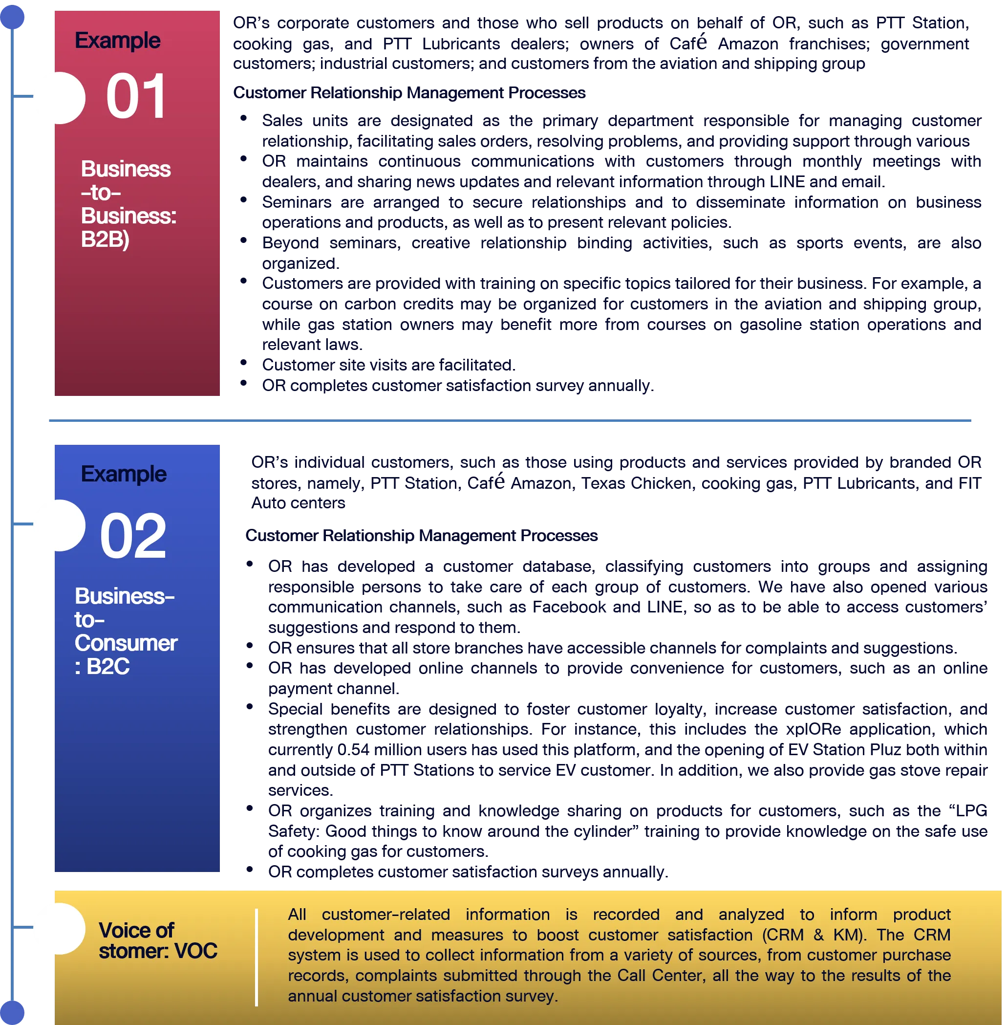 - B2C: Categorized by the OR-branded products and services used by the customer – e.g., PTT Station, Café Amazon, Texas Chicken, Cooking Gas, PTT Lubricants, and FIT Auto.