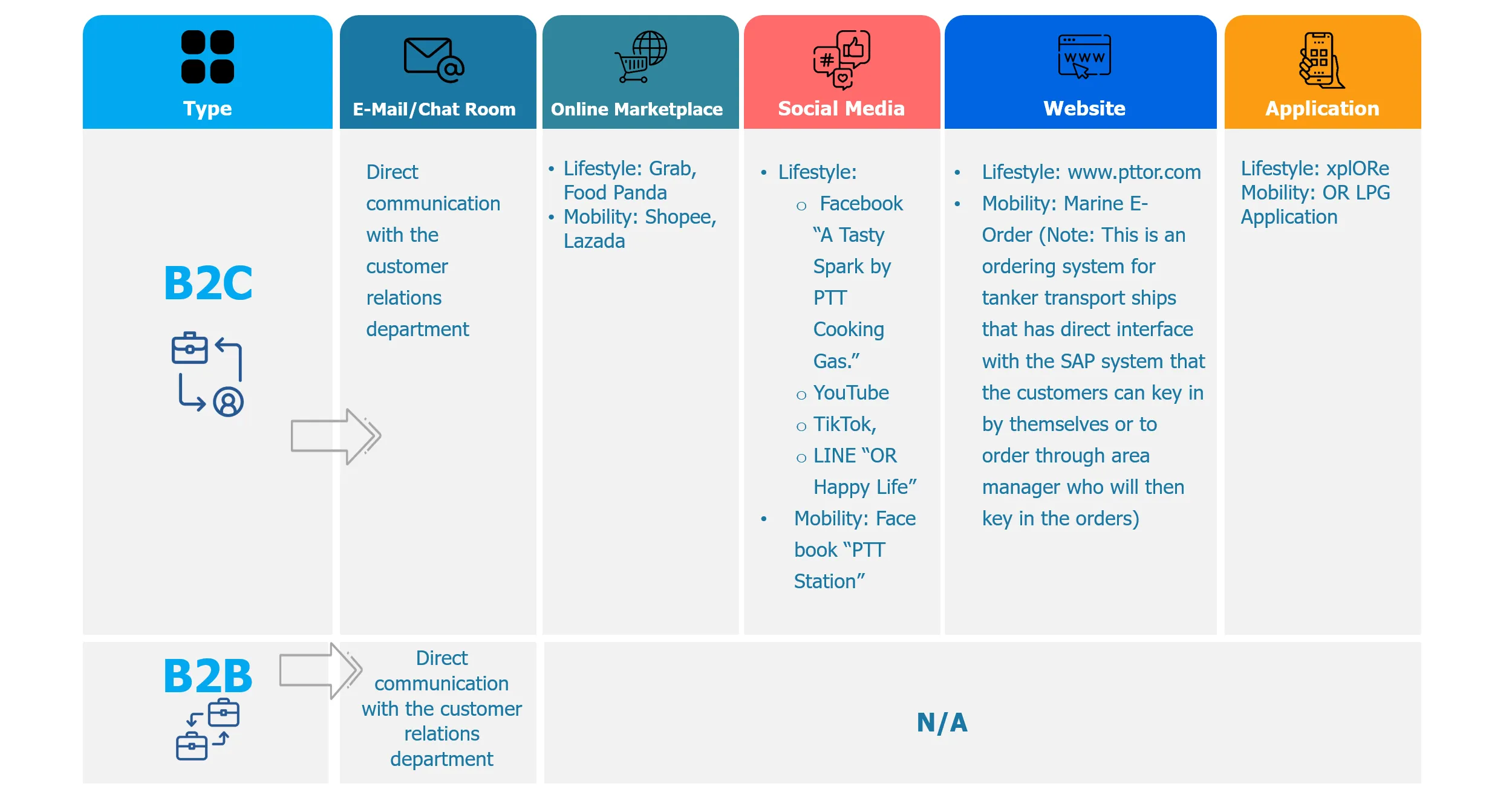 - B2B: Categorized by business group – e.g., PTT Station, Cooking Gas, and PTT Lubricants dealers; owners of Café Amazon franchises; government customers; industrial customers; and customers from the aviation and shipping group