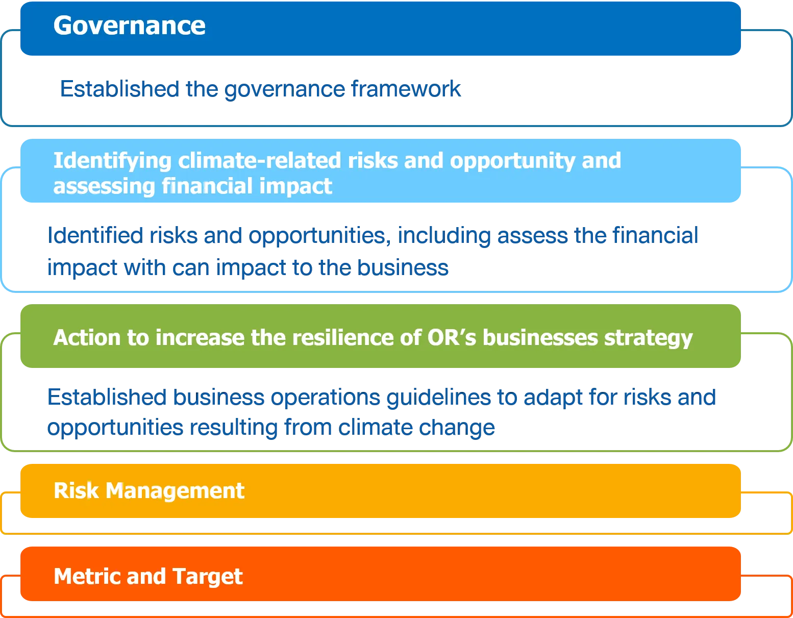 OR is formulating a Climate Strategy and establishing a clear framework for overseeing climate change, as well as the assessment of risks and opportunities related to climate change issues. This includes conducting a Climate Scenario Analysis based on the guidelines of the Task Force on Climate-related Financial Disclosure (TCFD). The aim is to understand the impacts and opportunities for business operations arising from climate change issues. This covers both Physical Risk and Transition Risk. The climate strategy’s ultimate goal is to progress towards the Net Zero Emissions target, which involves referencing the principles outlined by the Science-Based Target Initiative (SBTi) and develop the 3R Strategies for business operations which are Reduce, Remove, and Reinforce.