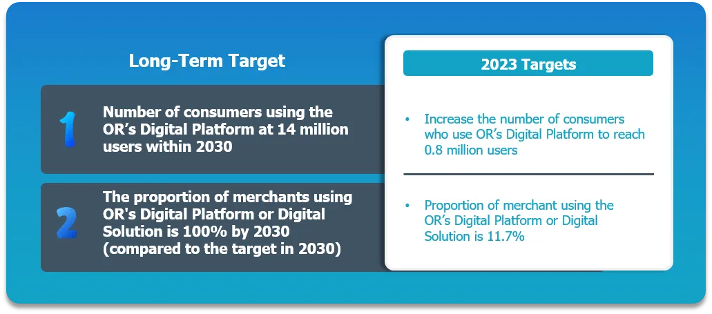 Digital to Revenue is one of OR’s key strategies. The xplORe application has been developed as OR’s core digital platform to centralize and deliver a seamless customer experience, response to the needs of modern consumers and to pass on the O2O (online-to-offline) transactions – from the online platform to stores of OR’s group and partners in the offline world, such as PTT Stations, Fit Auto, Café Amazon, Jiffy, Ohkajhu, etc. OR officially launched the xplORe application in August 2023, first with basic features and integration many OR applications tasked with delivering related experiences on xplORe such as Blue Card, Blue CONNECT, etc.and also plans to constantly develop additional features to attract interest of the platform, including further developing the potential of the existing basic features to achieve higher capabilities. Currently, xplORe is focused on reaspons the needs of customers in travel-related businesses and food & beverage businesses, as these are the business groups in which OR has expertise. In the future, the scope of services will be further expanded to cover OR’s target industry sectors, such as lifestyle, tourism, health, and beauty businesses, etc. In addition, xplORe has set a plan to focus on Data Monetization to jointly drive the Digital to Revenue strategy in OR’s big picture to achieve all the goals.