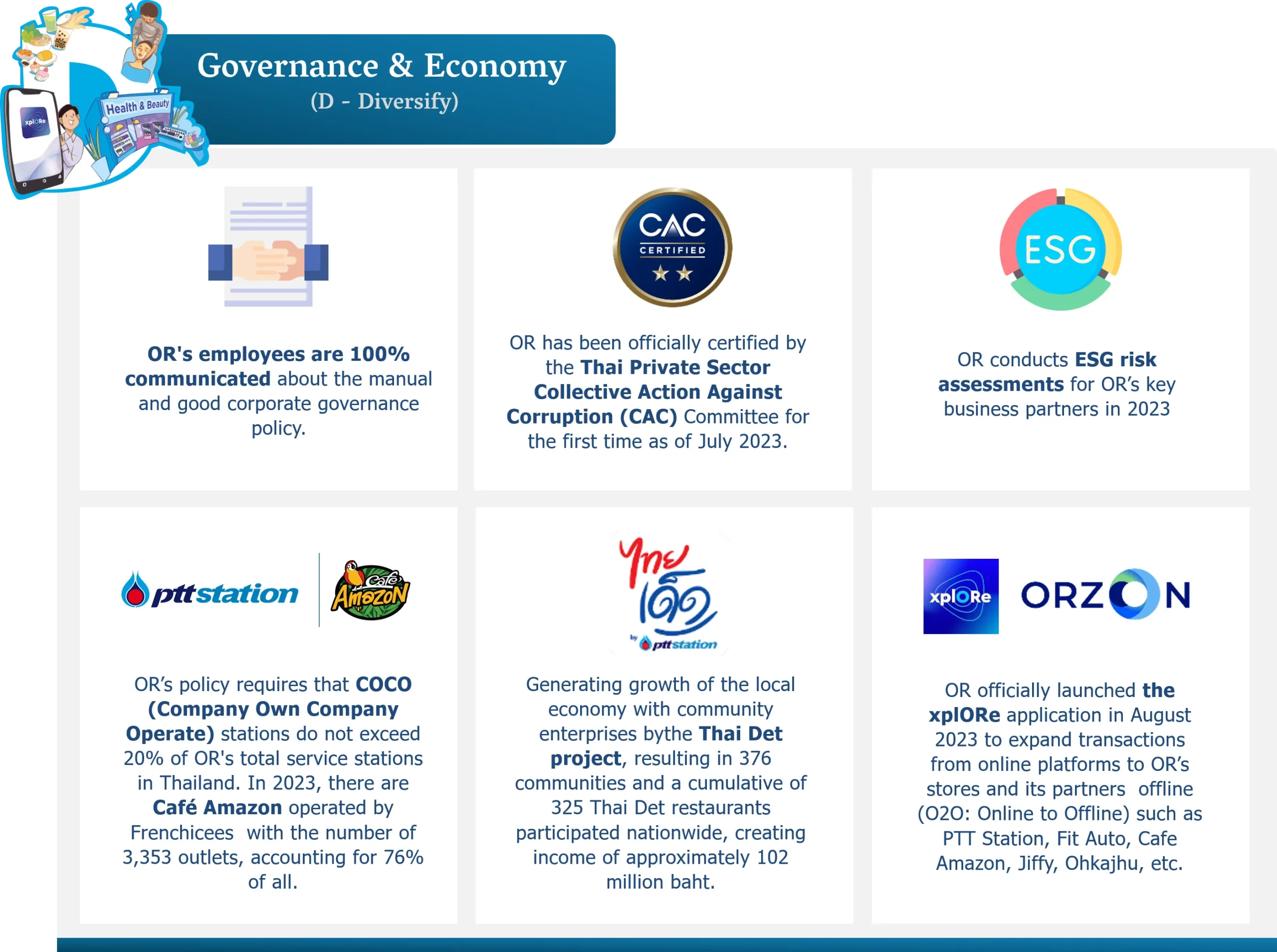 In addition, in 2023, OR conceptualizes sustainable future through OR’s SDGs to enhance opportunities to grow together with communities, economy, and society to effectively target OR 2030 goals. The OR SDGs consist of: