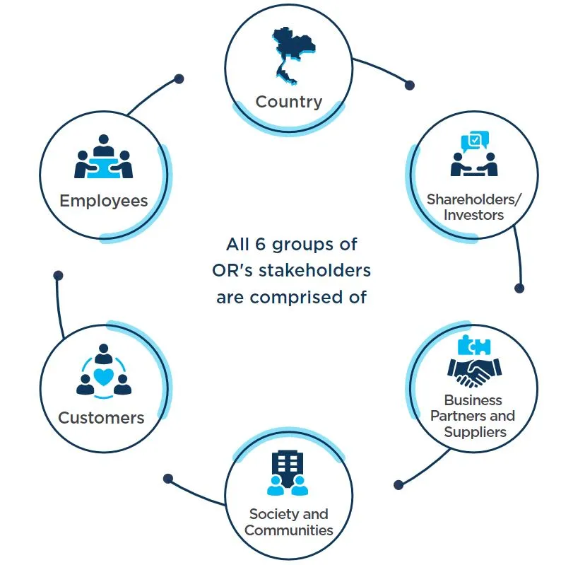 • Shareholders/Investors: Shareholders, investors, juristic persons, and institutions investing in the stock market • Employees: OR employees and employees hired through outside companies under OR’s supervision. • Business Partners and Suppliers: Suppliers of products and services • Society and Communities: Individuals who may be affected by business operations. |