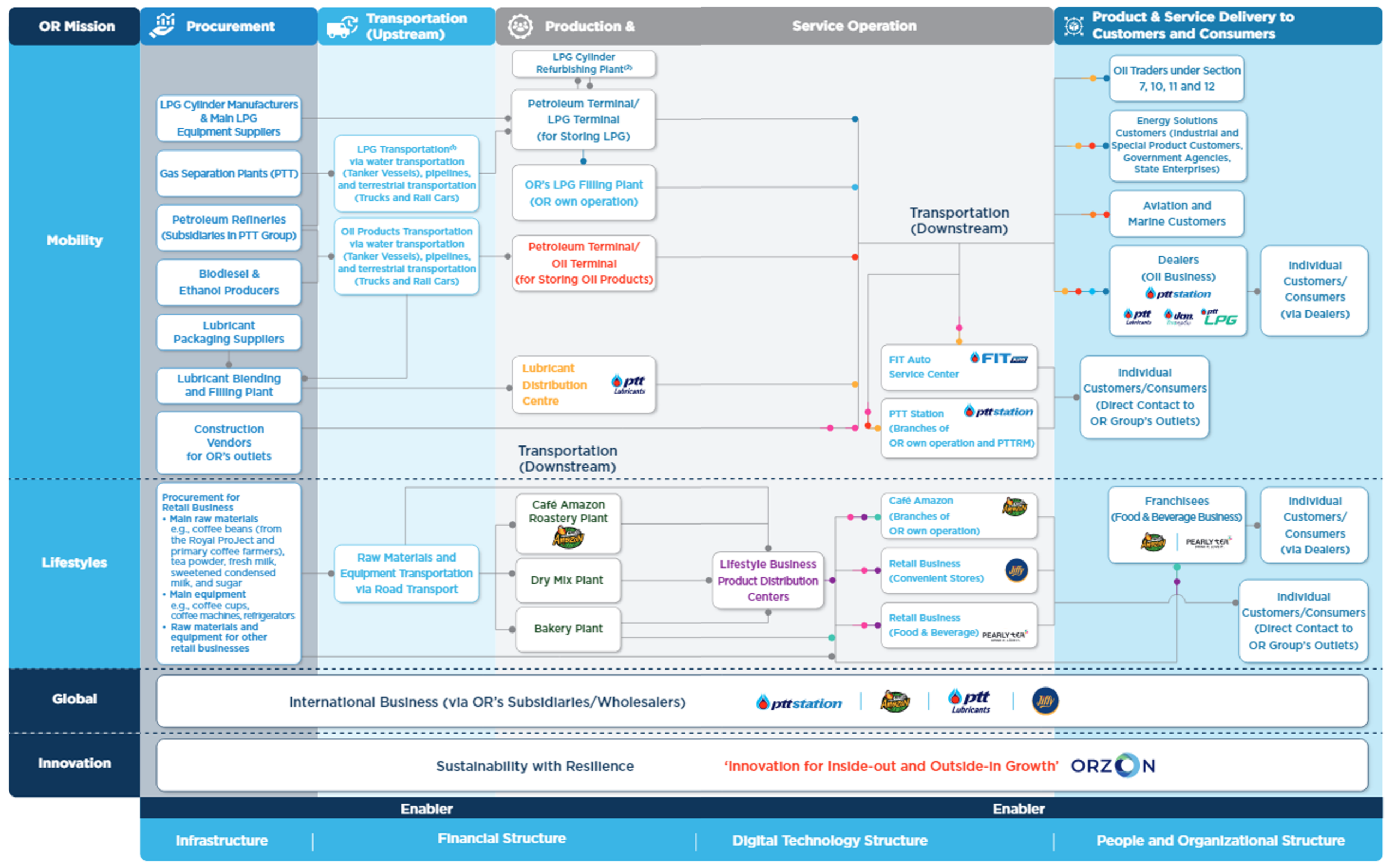 The structure of the business operations is divided into 4 main groups, namely the Mobility business, Lifestyle business, Global Business, and Innovation business. Key activities in the Mobility business include the distribution of petroleum products through retail markets, energy solutions, and lubricant business. The main products include gasoline, diesel, liquefied petroleum gas (LPG), aviation fuel, Marine fuel oil and industrial sectors, and lubricants. As for the Lifestyles business such as coffee shops, convenience stores, retail outlets, food and beverage businesses, as well as area management businesses in PTT Stations. The Global business group operates both Mobility and Lifestyles business through subsidiary companies established abroad. Additionally, OR has established ORZON Venture, to seek investment opportunities in start-up companies focusing on Mobility and Lifestyles, both domestically and internationally. Furthermore, there are support units such as OR Academy, Lifestyle Business Center (OASYS), Financial Structure, Digital Technology Structure, and People and Organizational Structure. Each activity is related to OR’s six main stakeholders as follows.