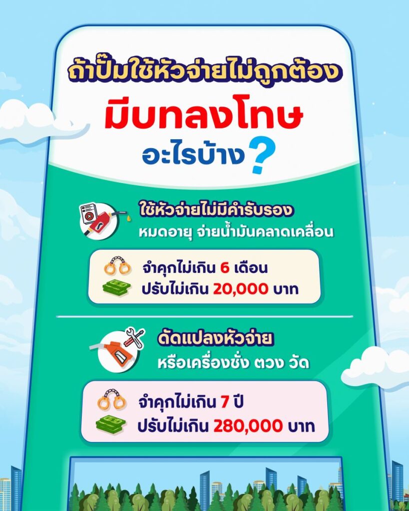 การใช้หัวจ่ายน้ำมันที่ไม่มีคำรับรอง/คำรับรองสิ้นอายุ และการจ่ายน้ำมันคลาดเคลื่อน มีโทษจำคุกไม่เกิน 6 เดือน ปรับไม่เกิน 20,000 บาท หรือทั้งจำทั้งปรับ และการดัดแปลงหัวจ่ายน้ำมันหรือเครื่องชั่งตวงวัดใดๆ มีโทษจำคุกไม่เกิน 7 ปี และปรับไม่เกิน 280,000 บาท