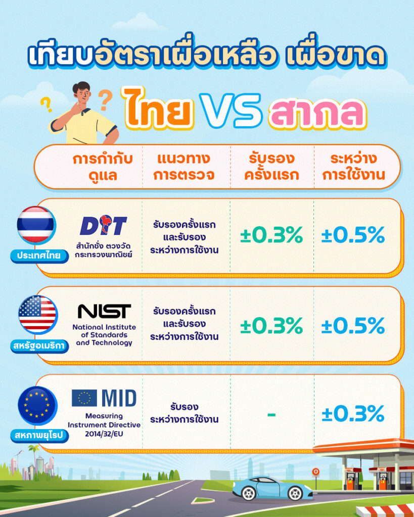 - ค่าอัตราเผื่อเหลือเผื่อขาด สำหรับการให้คำรับรองและการต่ออายุคำรับรอง ที่ ±0.3% ซึ่งเป็นค่าที่ใช้สำหรับการตรวจสอบสถานีบริการน้ำมันก่อนเปิดให้บริการครั้งแรก โดยจะมีอายุคำรับรอง 1 ปี เมื่อครบกำหนดสถานีบริการจะต้องได้รับการตรวจโดยสำนักชั่งตวงวัดอีกครั้ง จึงจะสามารถให้บริการต่อได้