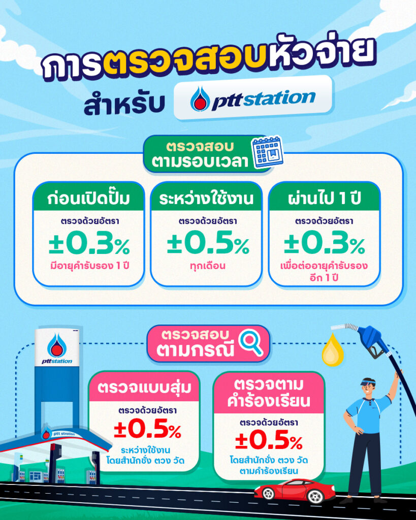มาตรวัดหัวจ่ายน้ำมันของสถานีบริการน้ำมันทุกแห่งภายในประเทศไทยรวมถึง PTT Station ได้รับการตรวจสอบ กำกับดูแลโดยสำนักชั่งตวงวัด กรมการค้าภายใน สังกัดกระทรวงพาณิชย์ ให้มีอัตราเผื่อเหลือเผื่อขาดในการจ่ายน้ำมันอยู่ในเกณฑ์ที่กำหนดเสมอ โดยไม่มีสถานีบริการน้ำมันใดสามารถเลือก ควบคุม ดัดแปลงปรับแต่ง มาตรวัดน้ำมันให้จ่ายน้ำมันตามที่ต้องการได้ ต้องดำเนินการโดยเจ้าหน้าที่สำนักชั่งตวงวัด หรือผู้ที่ได้รับอนุญาตจากสำนักชั่งตวงวัดเท่านั้น