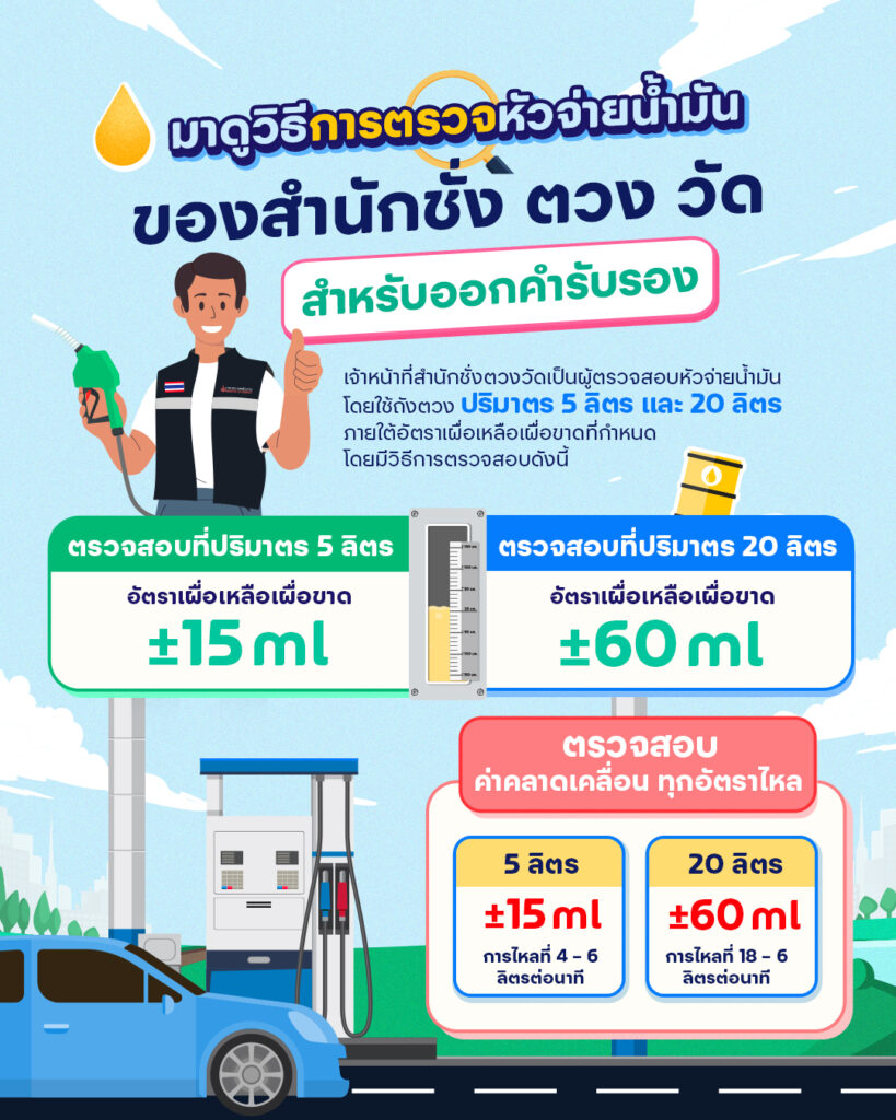 ทุกสถานีบริการน้ำมันจะได้รับการตรวจเพื่อต่ออายุคำรับรองโดยสำนักชั่งตวงวัดทุก 1 ปี และทุกต้นเดือนสถานีบริการจะต้องตรวจสอบความคลาดเคลื่อนของการจ่ายน้ำมันอย่างน้อย 1 ครั้งต่อเดือน โดยใช้ถังตวง 5 ลิตร ตรวจสอบทุกหัวจ่าย พร้อมทำบันทึกส่งให้เจ้าหน้าที่สำนักชั่งตวงวัด โดยใช้อัตราเผื่อเหลือเผื่อขาดสำหรับระหว่างการใช้งานที่ ± 0.5%