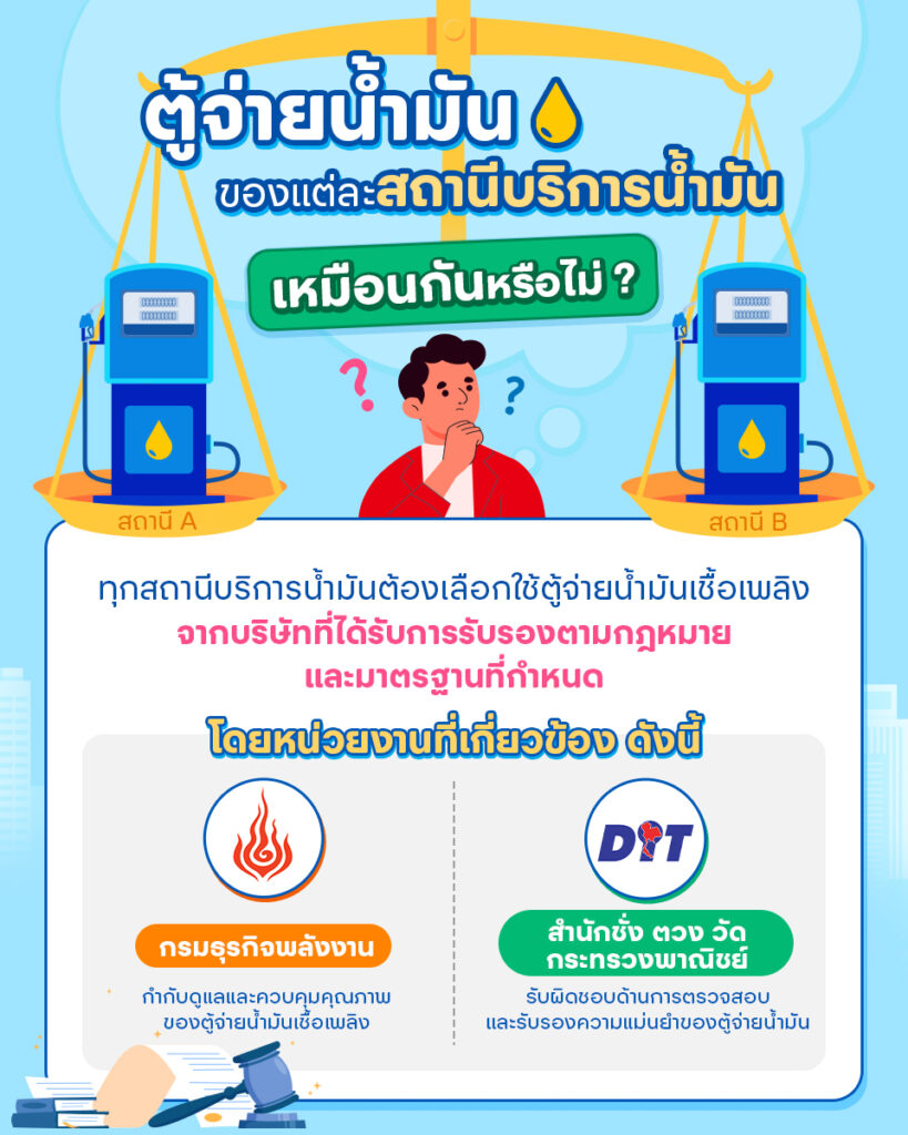 - สำนักงานชั่งตวงวัด (Department of Internal Trade) ภายใต้กระทรวงพาณิชย์ รับผิดชอบด้านการตรวจสอบและรับรองความแม่นยำของตู้จ่ายน้ำมัน เพื่อให้มั่นใจว่าตู้จ่ายน้ำมันที่ใช้งานในประเทศไทยมีความแม่นยำตามมาตรฐานที่กฎหมายกำหนด