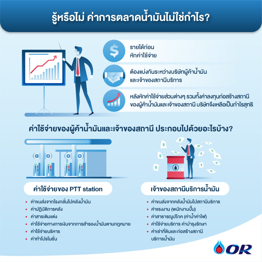 ในโครงสร้างราคาน้ำมัน มีส่วนหนึ่งที่เรียกว่าค่าการตลาด แต่ค่าการตลาดในที่นี้ไม่ได้หมายถึงกำไรสุทธิของบริษัทน้ำมัน เนื่องจากยังไม่ได้หักค่าใช้จ่ายต่างๆ ที่เกิดขึ้น ไม่ว่าจะเป็น :