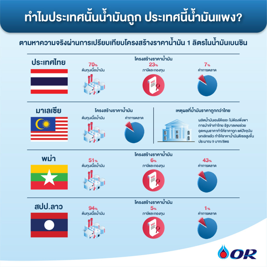 ในด้านโครงสร้างของราคาน้ำมันแล้ว แต่ละประเทศจะมีองค์ประกอบของโครงสร้างราคาที่คล้ายกันคือ (1) ต้นทุนเนื้อน้ำมัน (2) ภาษีและกองทุน (3) ค่าการตลาด แต่สัดส่วนของแต่ละองค์ประกอบในแต่ละประเทศจะไม่เหมือนกัน ขึ้นอยู่กับต้นทุนการผลิตและการนำเข้า โครงสร้างภาษีและกองทุน และรัฐบาลนโยบาย ประเทศมาเลเซียที่จัดว่าเป็นประเทศที่มีปริมาณการส่งออกน้ำมันดิบมากกว่าการนำเข้า หมายความว่ามาเลเซียสามารถผลิตน้ำมันดิบได้เกินจากความต้องการใช้ภายในประเทศ ซึ่งนอกจากจะให้มาเลเซียมีต้นทุนของเนื้อน้ำมันที่ต่ำแล้ว รัฐบาลยังมีนโนบายการสนับสนุนราคาน้ำมันอีกด้วย ช่วยให้ราคาน้ำมันในประเทศมาเลเซียถูกกว่าไทย ทั้งนี้ ปัจจุบัน ประเทศมาเลเซียได้ประกาศยกเลิกการอุดหนุนราคาน้ำมันดีเซลแล้วส่งผลให้ราคาน้ำมันดีเซลในมาเลเซียปรับตัวสูงขึ้นประมาณ 9 บาท/ลิตร แต่สาเหตุที่ราคายังคงถูกกว่าประเทศไทย เพราะโครงสร้างราคา ภาษี และกองทุน แตกต่างกัน
