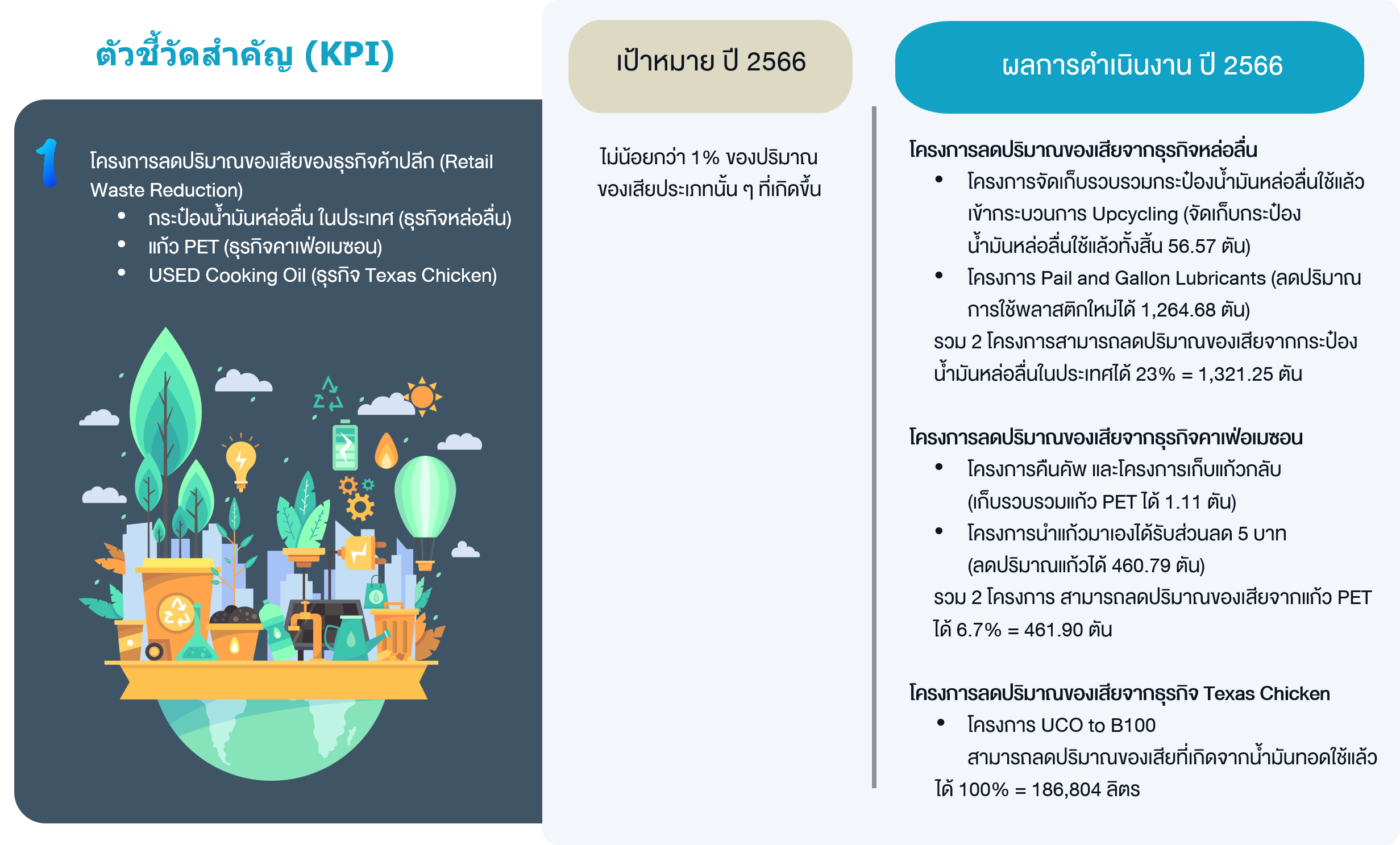- การปรับเปลี่ยนพฤติกรรมผู้บริโภคในการลดใช้ทรัพยากรและบรรจุภัณฑ์ เช่น ส่งเสริมการใช้ถุงผ้า และการมีส่วนลดให้กับลูกค้าที่นำแก้วส่วนตัวมาใช้ในร้าน Cafe Amazon เป็นต้น โดยปี 2566 สามารถลดการใช้แก้วพลาสติกได้ 460.79 ตัน
