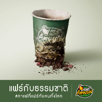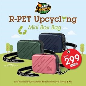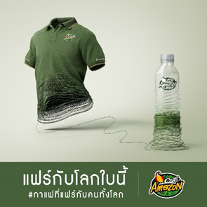 - เสื้อพนักงาน ผ้ากันเปื้อนพนักงานบาริสต้าในร้าน Café Amazon ทุกสาขาผลิตจากวัสดุ Upcycling โดยการนำแก้วและขวดพลาสติก PET บรรจุเครื่องดื่มที่ผ่านการใช้งานแล้วมาย่อยเป็นชิ้นเล็ก ๆ ผ่านกระบวนการให้ความร้อนที่อุณหภูมิประมาณ 180-220 องศาเซลเซียส เพื่อให้พลาสติกหลอมละลาย จากนั้นดึงออกมาเป็นเส้นใยรีไซเคิลโดยใช้เครื่องรีดพลาสติก ส่งให้โรงงานสิ่งทอออกแบบรูปแบบการทอ นำไปทอเป็นผืนผ้า และตัดเย็บออกมาเป็นผลิตภัณฑ์