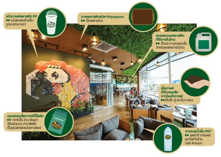 - Café Amazon ทุกร้านใช้วัสดุตกแต่งและเฟอร์นิเจอร์ที่เป็นมิตรกับสิ่งแวดล้อมตามหลัก BCG (Bio Circular Green) เป็นองค์ประกอบ เพื่อบรรลุเป้าหมายการทำให้ทุกร้านเป็น Circular Economy