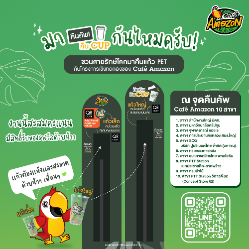 - การตกแต่งร้าน Cafe Amazon Concept Store ตามแนวความคิดของ Circular Economy เต็มรูปแบบ ผ่านการใช้วัสดุตกแต่งและเฟอร์นิเจอร์ที่เป็นมิตรกับสิ่งแวดล้อมตามหลัก BCG (Bio Circular Green) 100% และการเป็นจุด Drop Point ของโครงการคืนคัพ ในการเก็บรวบรวมแก้ว PET ใช้แล้ว เข้าสู่กระบวนการ Upcycling ต่อไป