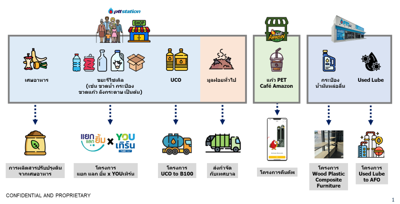 - การคัดแยกเศษอาหารจากร้านค้าต่างๆ มาแปรสภาพผ่านเครื่องย่อยเศษอาหารเป็นวัสดุปรับปรุงดิน เพื่อนำมาใช้ประโยชน์ภายในพื้นที่สถานีบริการน้ำมัน PTT Station
