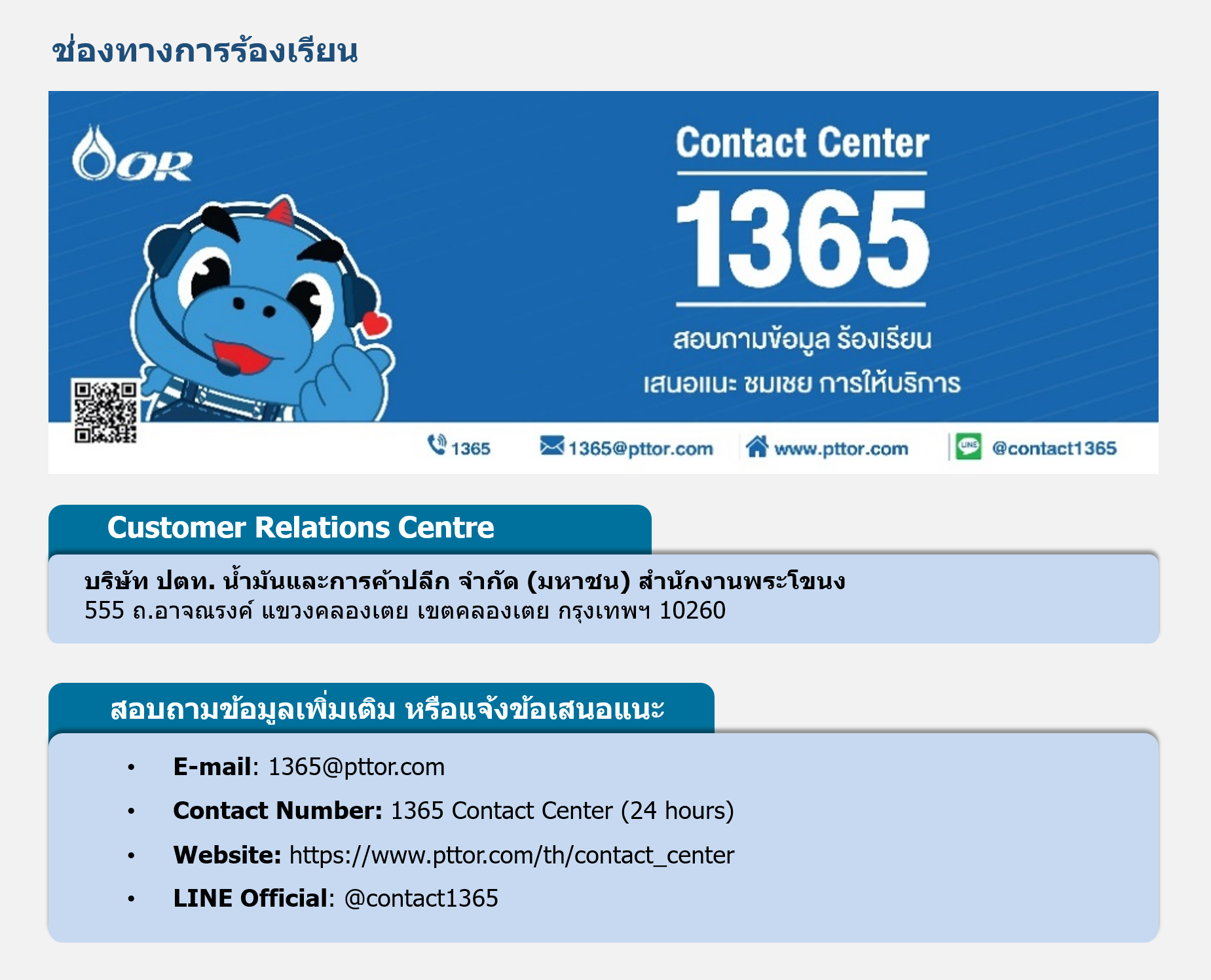 Telephone | 1365 (ตลอด 24 ชั่วโมง) 02-196-5959 (บริษัท ปตท. น้ำมันและการค้าปลีก จำกัด (มหาชน) สำนักงานใหญ่) |