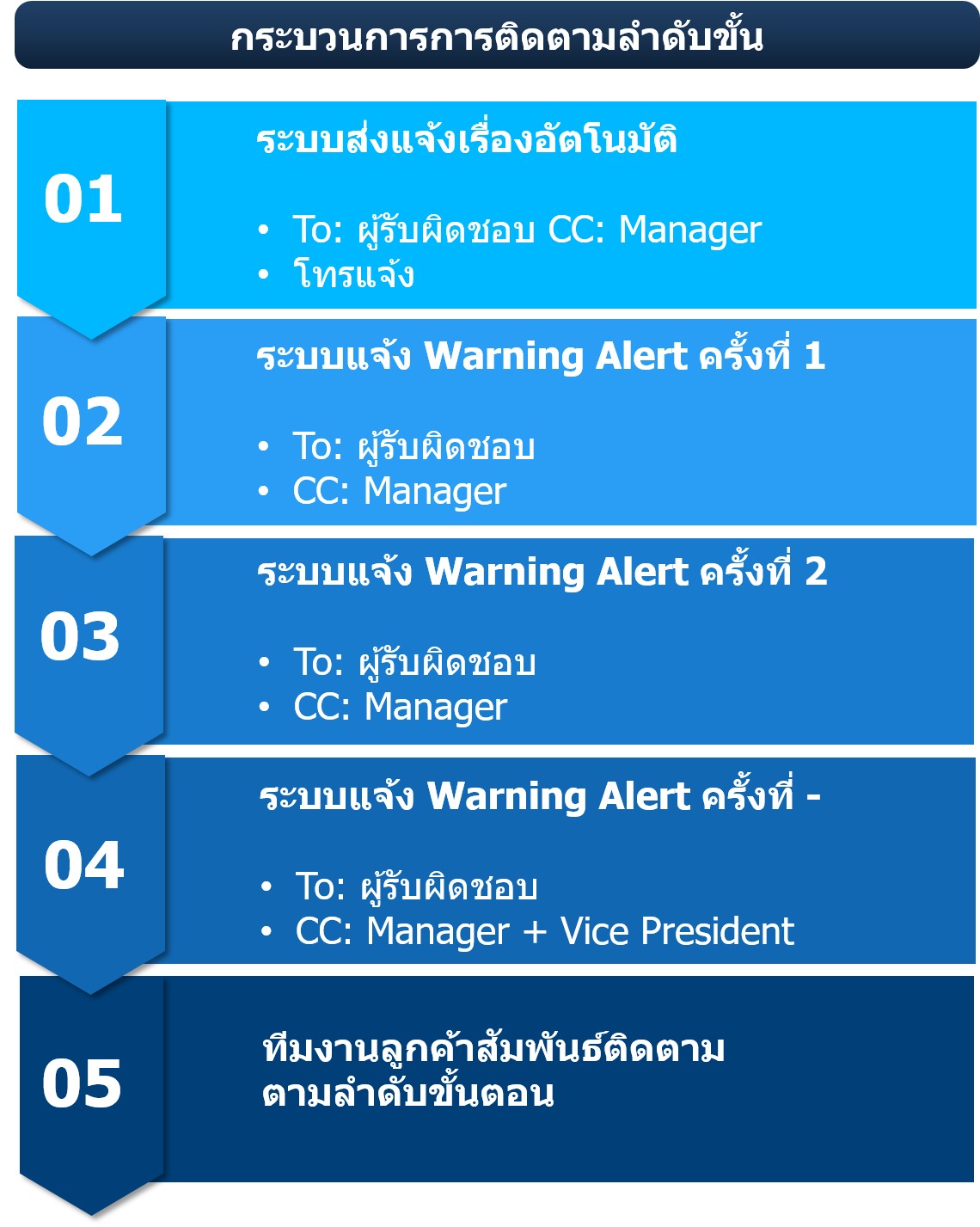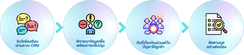 เมื่อ OR ได้รับข้อร้องเรียนจากลูกค้า หน่วยงานจะคัดกรองประเภทเรื่องที่ลูกค้าแจ้ง โดยเรื่องร้องเรียนจะถูกส่งต่อไปให้หน่วยงานที่เกี่ยวข้องเพื่อดำเนินการแก้ไขตามระยะเวลาการดำเนินการตอบสนอง และมีการติดตามสถานะการปรับปรุงหรือแก้ไข ตามข้อเสนอแนะกับหน่วยงานที่เกี่ยวข้อง เพื่อแจ้งผลการดำเนินการให้กับลูกค้า ซึ่งข้อมูลดังกล่าวจะถูกบันทึกในระบบ Customer Relationship Management (CRM)