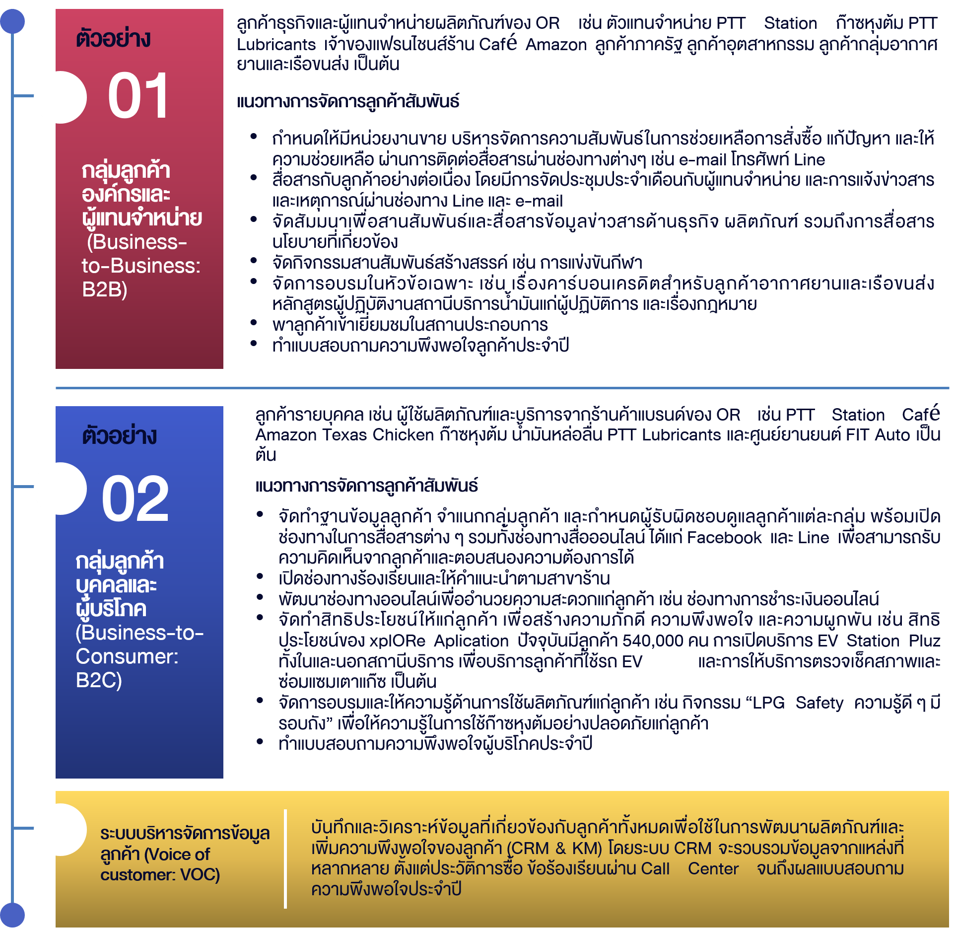 เนื่องจากธุรกิจของ OR มีลูกค้ารายองค์กร รวมถึงรายบุคคล จึงกำหนดแนวทางการบริหารจัดการลูกค้าสัมพันธ์แยกตามหน่วยธุรกิจ ดังนี้