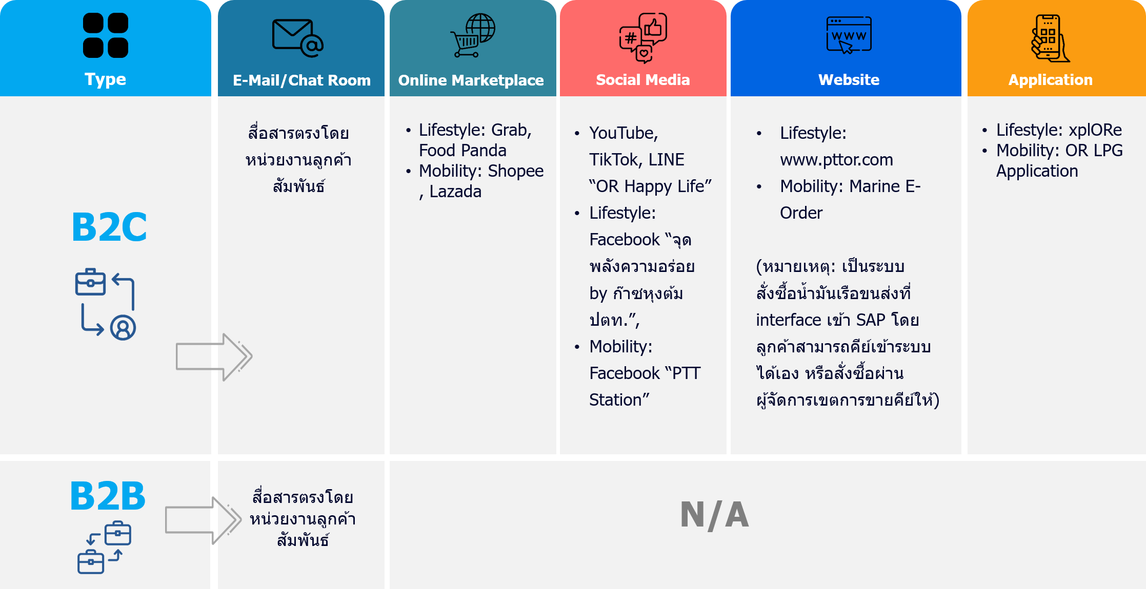 B2C: แบ่งตามผู้ใช้ผลิตภัณฑ์และบริการของแบรนด์ OR เช่น PTT Station Café Amazon Texas Chicken ก๊าซหุงต้ม น้ำมันหล่อลื่น PTT Lubricants และศูนย์บริการยานยนต์ FIT Auto เป็นต้น