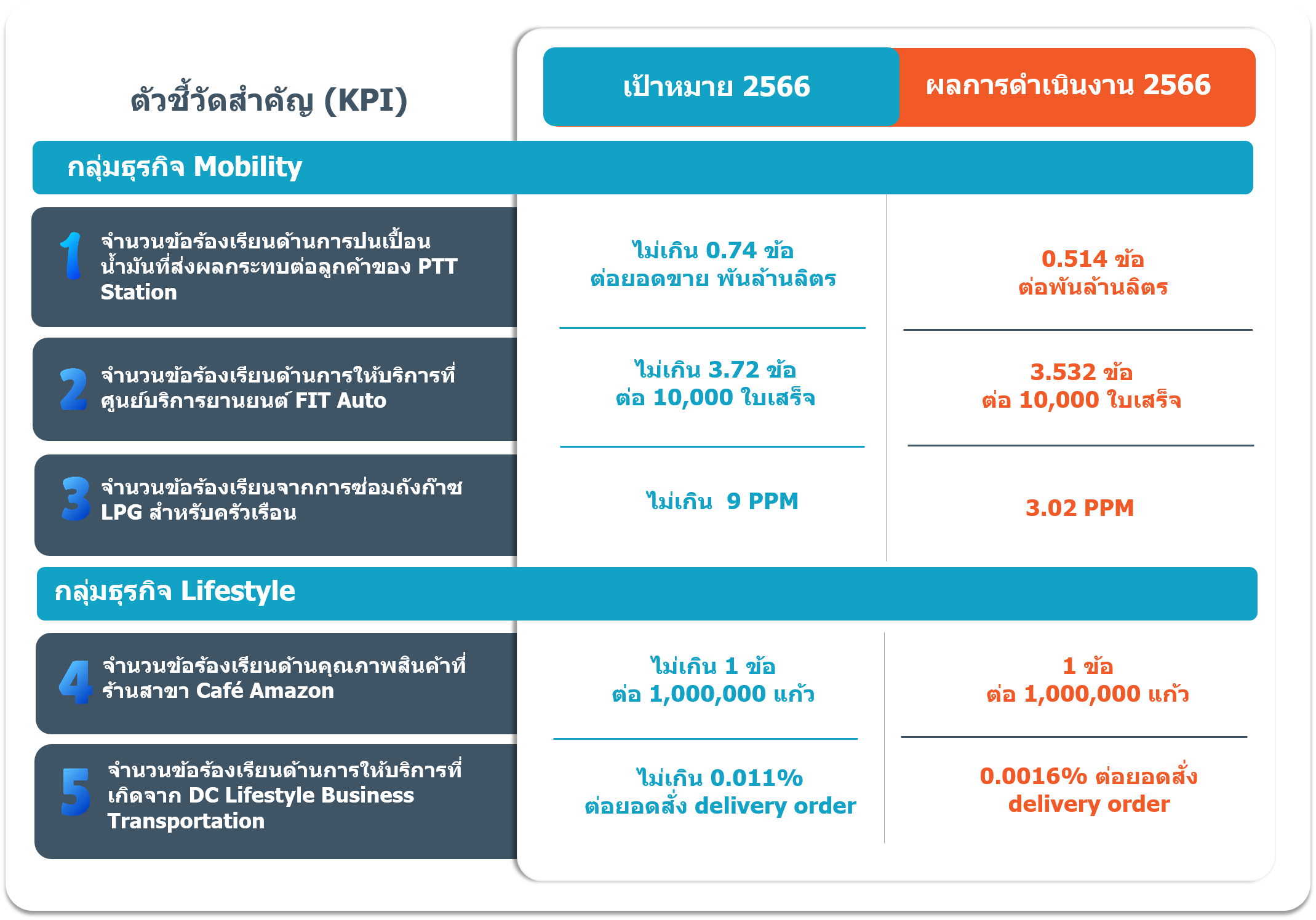 นอกจากนี้ OR ได้กำหนดให้มีช่องทางร้องเรียน โดยผู้บริโภคสามารถแจ้งข้อคิดเห็น และข้อเสนอแนะ ผ่านช่องทาง Contact Center 1365 และสื่อสังคมออนไลน์ ตลอด 24 ชั่วโมง เมื่อ OR ได้รับข้อคิดเห็น และข้อเสนอแนะจากผู้บริโภคแล้วจะดำเนินการตรวจสอบ แก้ไข และสื่อสารแนวทางการแก้ไขและป้องกันทันที เพื่อแสดงความจริงใจต่อการตอบสนองข้อร้องเรียน และสร้างความเชื่อมั่นให้กับผู้บริโภคหรือผู้ร้องเรียนให้กลับมาไว้วางใจในสินค้าและการบริการของ OR ต่อไป
