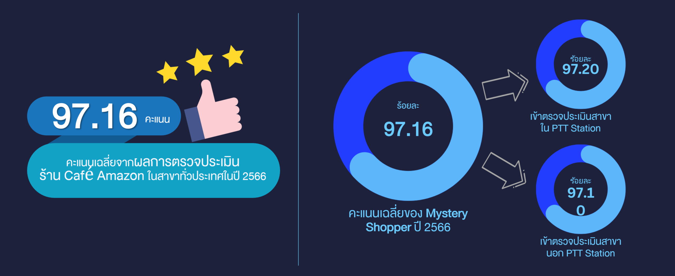 ในปี 2566 มีการเข้าตรวจประเมิน Café Amazon ประกอบด้วยการตรวจแบบ Standard Audit (Quality Services Cleanliness; QSC) ทุกสาขา จำนวน 4,045 สาขา (1 ครั้ง/สาขา/เดือน) แบบ Operation Audit (Store Audit) สำหรับร้านสาขาที่ OR บริหารเอง เฉลี่ยมากกว่า 3 ครั้ง/สาขา/ปี และแบบ Mystery Audit (3rd party) ทุกสาขา (ยกเว้นพื้นที่ 3 จังหวัดชายแดนใต้) จำนวน 3 ครั้ง/สาขา/ปี ทั้งนี้ Café Amazon ทั้งหมด 4,045 สาขา ได้รับการตรวจประเมินอย่างน้อย 1 ครั้ง/เดือน หรือ 100 % ของจำนวนสาขาในประเทศทั้งหมดในปี 2566 จากผลการตรวจประเมิน พบว่าคะแนนโดยเฉลี่ยของผลการตรวจแบบ Standard Audit (Quality Services Cleanliness; QSC) Café Amazon อยู่ที่ 97.16 คะแนน (*ร้อยละ 97.16) คิดเป็นสาขาใน PTT Station เท่ากับ 97.20 คะแนน และสาขานอก PTT Station เท่ากับ 97.10 คะแนน