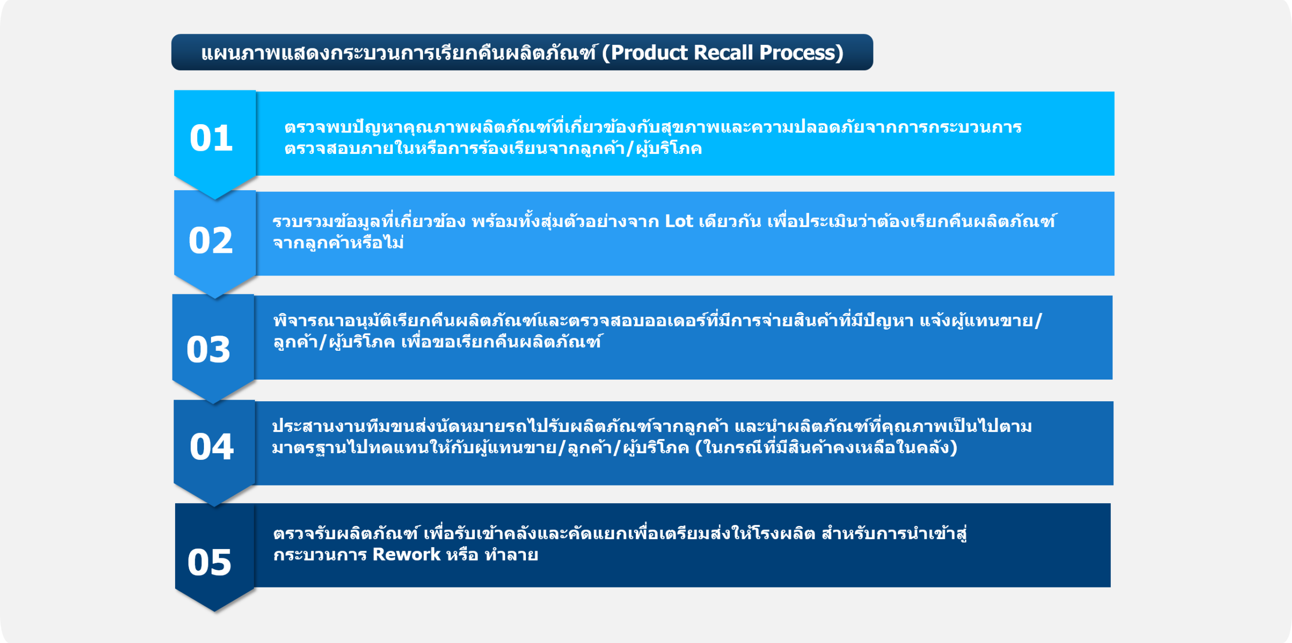 OR มีการกำหนดกระบวนการเรียกคืนผลิตภัณฑ์ตามหน่วยธุรกิจที่มีลักษณะการดำเนินงานที่แตกต่างกัน เพื่อให้มั่นใจว่า OR รับผิดชอบต่อการควบคุมคุณภาพผลิตภัณฑ์ที่เกี่ยวข้องกับสุขภาพและความปลอดภัย โดยมีการกำหนดขั้นตอน ผู้มีอำนาจอนุมัติกระบวนการเรียกคืนกลับอย่างชัดเจน เพื่อป้องกันให้ผลิตภัณฑ์ที่ไม่ได้มาตรฐานก่อนถึงมือผู้บริโภค (End Consumer)