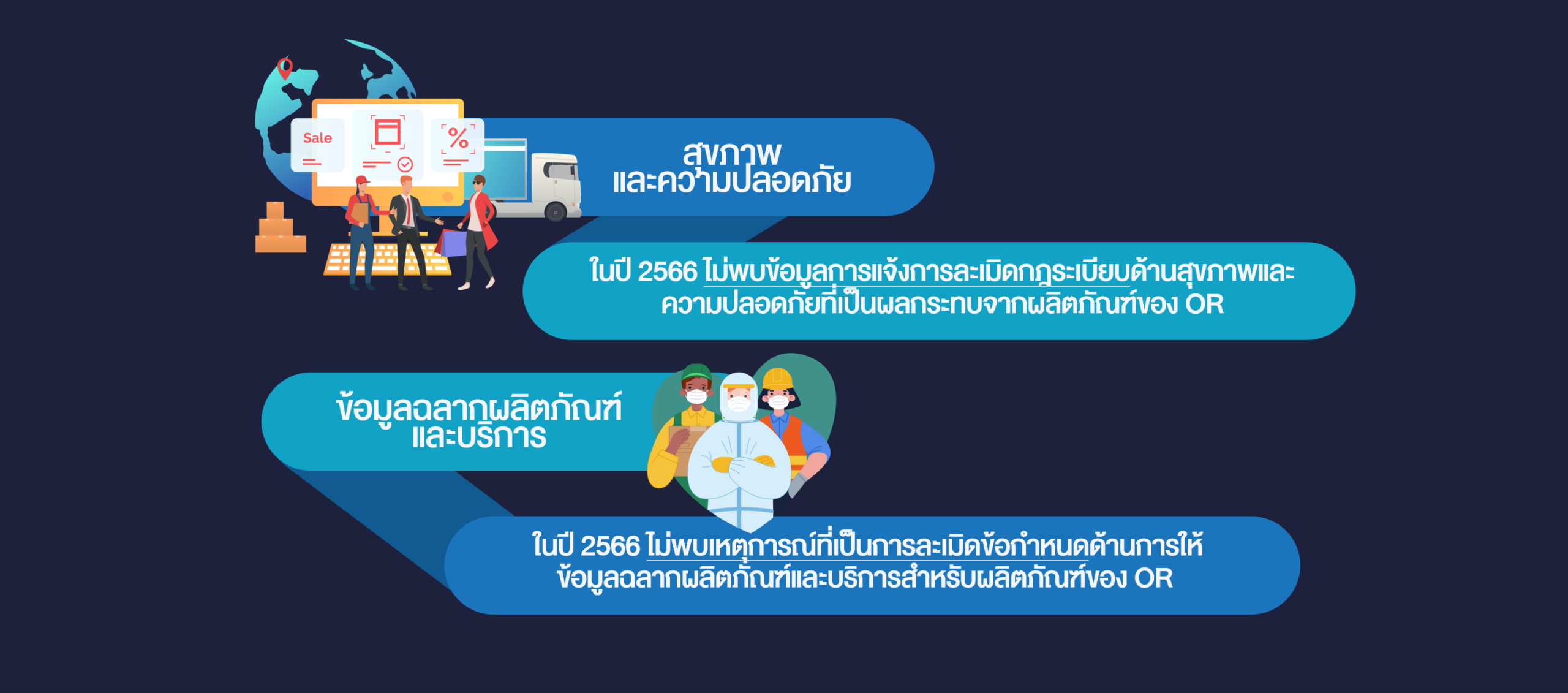 OR กำหนดแผนงานที่เกี่ยวข้องกับการดูแลผลิตภัณฑ์และบริการตามการดำเนินธุรกิจที่แตกต่างกัน รวมถึงกำหนดหัวข้อ Product and Service Standard: Quality/Safety/Environment เป็นหนึ่งในความเสี่ยงองค์กร (Corporate Risk Profile) ด้านความเสี่ยงในการดำเนินธุรกิจและการดำเนินงาน (Business & Operational Risk) เพื่อเน้นย้ำถึงความสำคัญของการดูแลผลิตภัณฑ์และบริการในธุรกิจ ทั้งนี้มีการจัดอบรมให้ความรู้กับพนักงานผู้ปฏิบัติงานเกี่ยวกับการดูแลผลิตภัณฑ์และบริการในธุรกิจที่รับผิดชอบ มีระบบการติดตามกฎหมายที่เกี่ยวข้องกับการดำเนินงานเพื่อส่งมอบผลิตภัณฑ์และบริการ (QSHE Legal Compliance) รวมถึงมีระบบการตรวจประเมินโดยบุคคลภายในซึ่งเป็นหน่วยงานที่เกี่ยวข้อง (Internal Audit) และหน่วยงานภายนอกองค์กร (External Audit by Third Party) เพื่อให้มั่นใจว่าผลิตภัณฑ์และบริการเป็นไปตามมาตรฐานที่กำหนดและกฎหมายที่เกี่ยวข้อง มีการส่งรายงานการตรวจประเมินแก่ผู้บริหารและหน่วยงานที่เกี่ยวข้องในรูปแบบรายงานประจำเดือน โดยการบริหารงานด้านการดูแลผลิตภัณฑ์และบริการ จะถูกทบทวนตามช่วงเวลาอย่างสม่ำเสมอหรือเมื่อมีการเปลี่ยนแปลงองค์กรหรือธุรกิจที่มีนัยสำคัญ