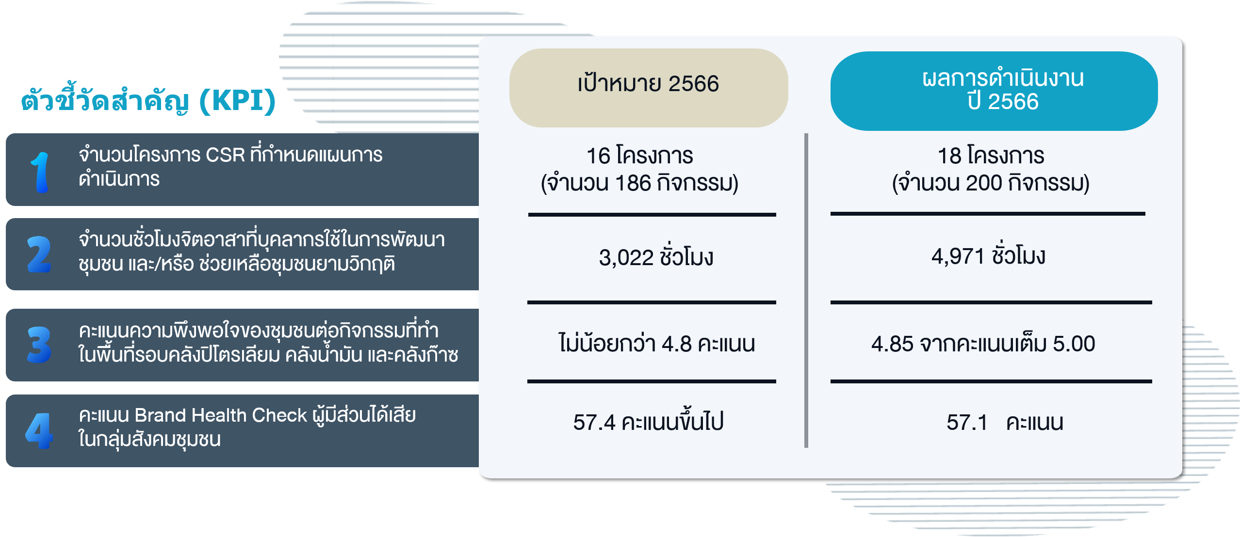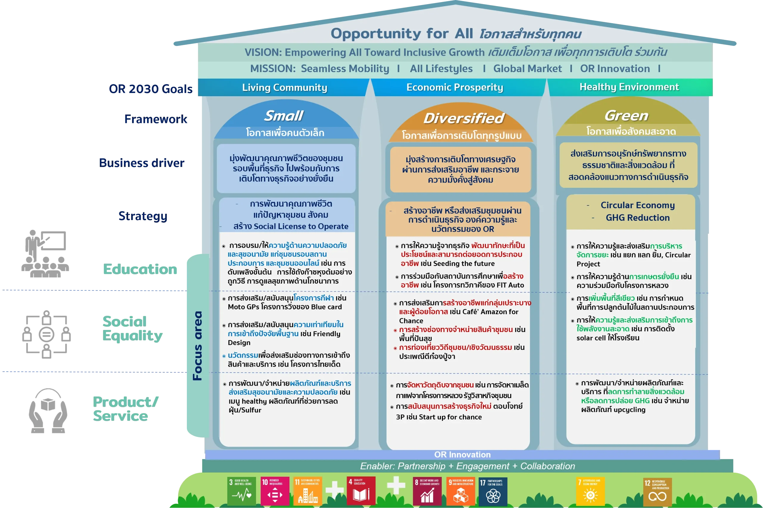การดำเนินงานด้านความรับผิดชอบต่อสังคมช่วยส่งเสริมการบรรลุเป้าหมายที่ยั่งยืนของบริษัทฯ “OR 2030 Goals” ได้แก่ Living Community, Healthy Environment, และ Economic Prosperity และสอดคล้องกับเป้าหมายการพัฒนาที่ยั่งยืนขององค์การสหประชาชาติ (SDGs) จำนวน 9 เป้าหมาย โดยเพิ่มเติมเป้าหมายที่ 4 Quality Education สำหรับการดำเนินงานภายใต้กรอบการดำเนินงานด้านความรับผิดชอบต่อสังคม ทั้งนี้ OR จัดกลุ่มการดำเนินโครงการและกิจกรรมความรับผิดชอบต่อสังคมตามวัตถุประสงค์และลักษณะการจัดการประเด็นทางสังคมและสิ่งแวดล้อมออกเป็น 3 ด้านหลัก รวมถึงกำหนดตัวชี้วัดเพื่อวัดผลการดำเนินงานต่าง ๆ รายละเอียดดังนี้