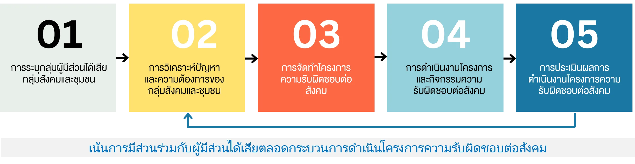 โครงการความรับผิดชอบต่อสังคมของ OR เป็นผลที่ได้จากการวิเคราะห์ปัญหาและความต้องการของกลุ่มสังคมและชุมชน ผ่านการมีส่วนร่วมกับผู้มีส่วนได้เสียซึ่งมีรูปแบบที่แตกต่างกันไปตามความเหมาะสม เพื่อเปิดโอกาสให้ผู้มีส่วนได้เสียได้มีส่วนร่วม (Stakeholder Engagement) แสดงความคิดเห็น รวมถึงร่วมหารือกับหน่วยงานที่เกี่ยวข้อง เพื่อนำผลจากการรับฟังความคิดเห็นไปวางแผนโครงการและการดำเนินกิจกรรมที่จะเสริมสร้างการพัฒนาชุมชนร่วมกัน ทั้งยังเป็นการสร้างความสัมพันธ์อันดีกับชุมชนโดยรอบ (Community Relation) อีกทั้งมีการจัดการประเมินระหว่างและหลังการดำเนินงานโครงการ เพื่อทบทวนและพัฒนาการทำงานให้ตอบสนองกลุ่มผู้รับประโยชน์ของโครงการมากที่สุด พร้อมกันนี้ OR ได้พัฒนาเครื่องมือสำหรับจัดทำโครงการความรับผิดชอบต่อสังคม สำหรับใช้ในการกำหนดแผนงานโครงการและรายงานผลการดำเนินงานร่วมกับกลุ่มผู้มีส่วนได้เสีย ต่อผู้มีอำนาจอนุมัติที่ได้รับมอบหมาย