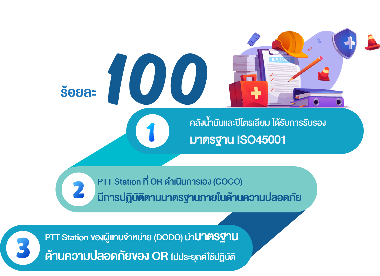 การเพิ่มความหลากหลายของการดำเนินธุรกิจของ OR เป็นส่วนหนึ่งที่ OR ต้องให้ความสำคัญด้านความปลอดภัยและอาชีวอนามัยในการดำเนินธุรกิจที่เหมาะสมต่อธุรกิจมากยิ่งขึ้น เพื่อสร้างความเชื่อมั่นในการเป็นสถานประกอบการและธุรกิจที่ปลอดภัยให้แก่ พนักงาน คู่ค้า และผู้ปฏิบัติงานในพื้นที่ (ผู้รับเหมา) ผู้ร่วมทุน รวมไปถึงชุมชนที่อยู่ใกล้เคียงสถานประกอบการของ OR โดยตระหนักว่าประเด็นความปลอดภัยและอาชีวอนามัยนั้นเป็นส่วนหนึ่งของสิทธิขั้นพื้นฐานที่พนักงาน คู่ค้า และผู้ปฏิบัติงานในพื้นที่ (ผู้รับเหมา) ผู้ร่วมทุน และชุมชนรอบสถานประกอบการ OR ควรได้รับ ดังนั้น OR จึงกำหนดนโยบาย แนวทางและการบริหารจัดการความปลอดภัยและอาชีวอนามัย และคู่มือปฏิบัติงานที่สอดคล้องกับแนวปฏิบัติของประเทศไทยและมาตรฐานทางสากล โดยครอบคลุมตั้งแต่กระบวนการผลิต การขนส่ง ไปจนถึงการจำหน่ายสินค้าและบริการ ที่ครอบคลุมทั้งธุรกิจ Mobility และ Lifestyle