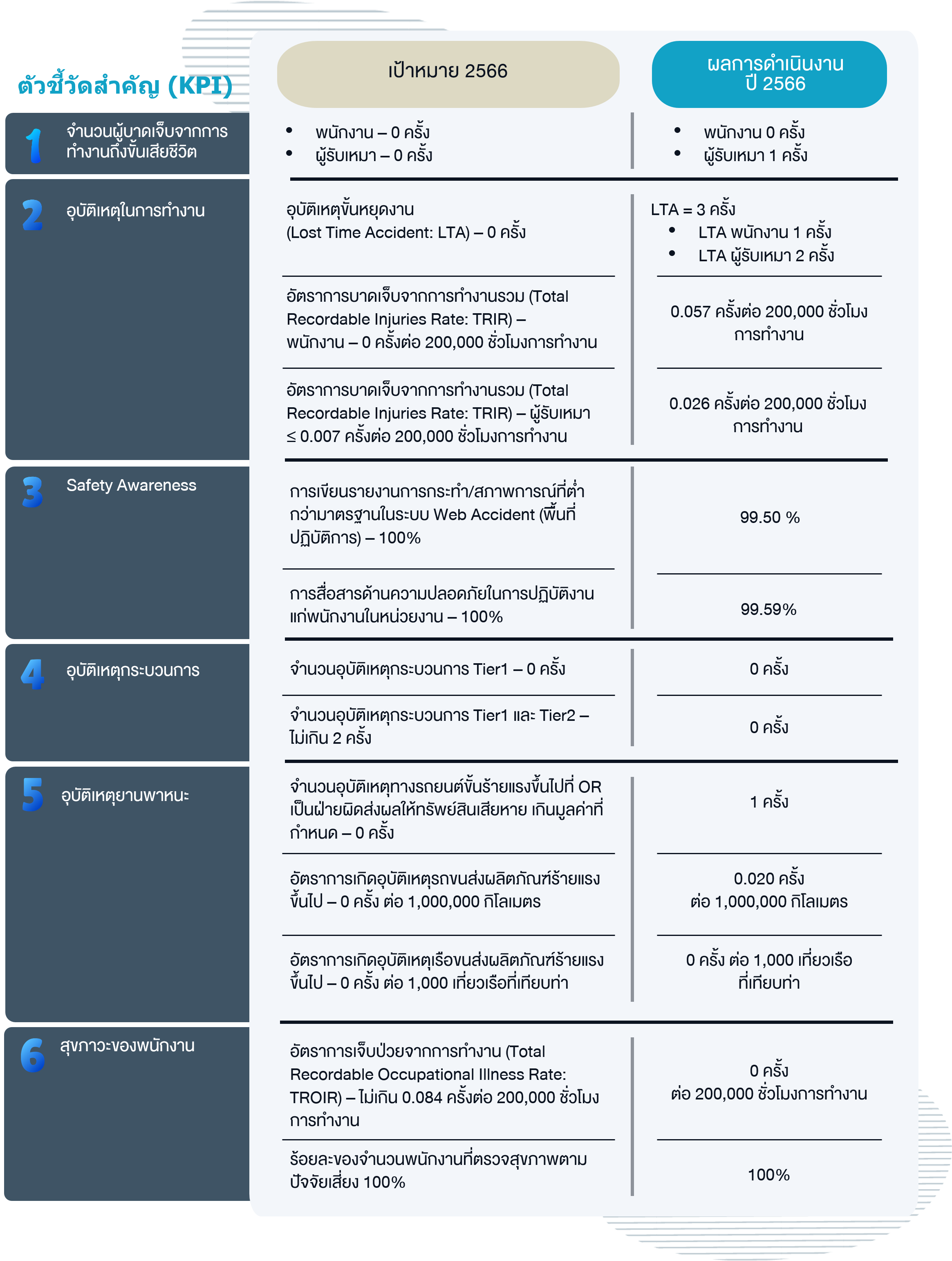 นอกจากนี้ OR กำหนดให้ฝ่ายบริหารความยั่งยืน และคุณภาพ ความปลอดภัย อาชีวอนามัย และสิ่งแวดล้อม (บยญ.) มีทีมงานด้านความปลอดภัย และอาชีวอนามัยทำหน้าที่ให้คำปรึกษาแก่พนักงานและบริหารจัดการงานด้านความปลอดภัยและอาชีวอนามัย รวมถึงการตั้งเป้าหมายด้านความปลอดภัยและอาชีวอนามัย ได้แก่ จำนวนอุบัติเหตุถึงขั้นหยุดงาน (Lost Time Accident: LTA) อัตราการบาดเจ็บจากการทำงาน (Total Recordable Injuries Rate: TRIR) อัตราการเจ็บป่วยจากการทำงาน (Total Reportable Occupational Illness Rate: TROIR) การค้นหาและรายงานการกระทำหรือสภาพแวดล้อมที่ต่ำกว่ามาตรฐาน การสื่อสารด้านความปลอดภัย อุบัติเหตุทางรถยนต์ (Major Car Accident) อุบัติเหตุรถขนส่งผลิตภัณฑ์ (Transportation Safety) และ ความปลอดภัยของกระบวนการผลิต (Process Safety) เป็นตัวชี้วัดองค์กร (Corporate KPI) ซึ่งเป็นตัวชี้วัดสำหรับการประเมินผลการดำเนินงานของผู้บริหารสายงาน พนักงาน และผู้ที่เกี่ยวข้องกับการบริหารจัดการในประเด็นด้านอาชีวอนามัยทั่วทั้งองค์กร (Corporate KPI)