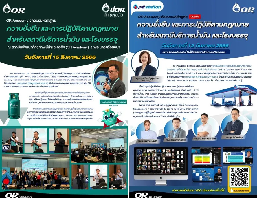 OR ได้กำหนดความรู้ด้านความปลอดภัยประจำปีที่จำเป็นสำหรับการปฏิบัติงาน เพื่อให้บรรลุเป้าหมาย Zero Accident และมอบหมายให้พนักงานพัฒนาความรู้ ทักษา ความสามารถผ่านวิธีต่าง ๆ อาทิ หลักสูตรการอบรม การเรียนรู้ด้วยตนเอง (Self-Study) การศึกษาพร้อมกับการปฏิบัติ (On the Job Training) นอกจากนี้ องค์กรมีกระบวนการจัดการความรู้ (Knowledge Management) เก็บไว้ในระบบหรือฐานข้อมูลกลางซึ่งผู้ปฏิบัติงานสามารถเข้าถึงได้ มีการจัดเก็บความรู้ที่สำคัญขององค์กร และนำมาสื่อความตามรอบของการทบทวนการจัดการ โดยในปี 2566 OR มีการจัดอบรมด้านความปลอดภัยและอาชีวอนามัยให้แก่พนักงานและผู้รับเหมารวมกันทั้งสิ้น 71 หลักสูตร โดยประกอบไปด้วยเนื้อหาการอบรมที่เกี่ยวข้องกับด้านความปลอดภัย อาทิ การทำงานที่มีอันตรายสูง การปฐมพยาบาลและการช่วยพื้นคืนชีพ First Aid & CPR การขับขี่อย่างปลอดภัย (Safety Drive) การดับเพลิงขั้นก้าวหน้า การใช้ระบบ Logout Tagout และระบบใบขออนุญาตทำงาน การชี้บ่งอันตรายและการประเมินความเสี่ยง Hazard and Operability Study (HAZOP) Layer of Protection Analysis (LOPA) การสร้างความตระหนักด้านความมั่นคงปลอดภัยสถานีบริการและร้านค้าปลีก เป็นต้น