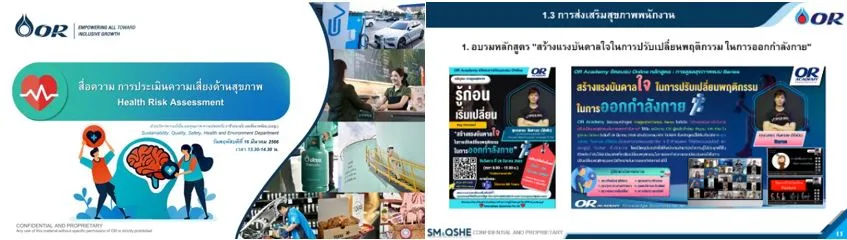 OR มีการประเมินความเสี่ยงด้านสุขภาพสำหรับพนักงานและลูกจ้างทดลองงานที่ทำงานเกี่ยวกับปัจจัยเสี่ยงเป็นประจำทุกปี รวมถึงมีการกำหนดแนวปฏิบัติเรื่องการตรวจสุขภาพพนักงานและลูกจ้างทดลองงานที่ทำงานเกี่ยวกับปัจจัยเสียง และดำเนินการตามโปรแกรมด้านสุขภาพโดยครอบคลุมการตรวจสุขภาพแรกเข้าทำงานของพนักงานใหม่ กรณีเปลี่ยนงาน (สรรหาภายในและโยกย้ายงาน) กรณีพ้นสภาพงานการเป็นพนักงาน และการตรวจสุขภาพอาชีวอนามัยประจำปีทั้งของพนักงานและผู้รับเหมาประจำ ทั้งนี้หน่วยงานต้นสังกัด (ผู้บังคับบัญชา) และฝ่ายบริหารความยั่งยืน และคุณภาพความปลอดภัย อาชีวอนามัย และสิ่งแวดล้อม (บยญ.) จะร่วมกันวิเคราะห์ผลตรวจสุขภาพของพนักงาน ซึ่งบันทึกอยู่ในรูปแบบ e-Health Book เพื่อนำมาใช้ในการประเมินความเสี่ยง และปรับปรุงสภาพพื้นที่ปฏิบัติงาน นำไปจัดทำโครงการส่งเสริมสุขภาพเพิ่มเติม เพื่อลดความเสี่ยงด้านสุขภาพของพนักงาน