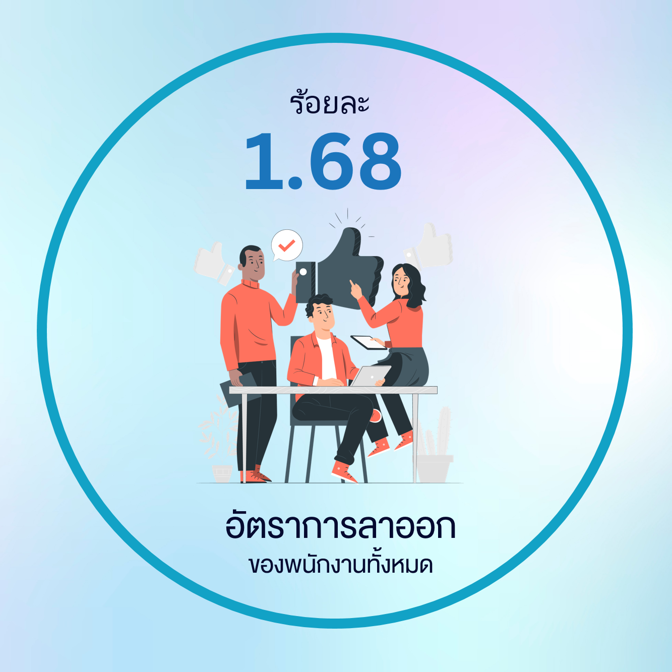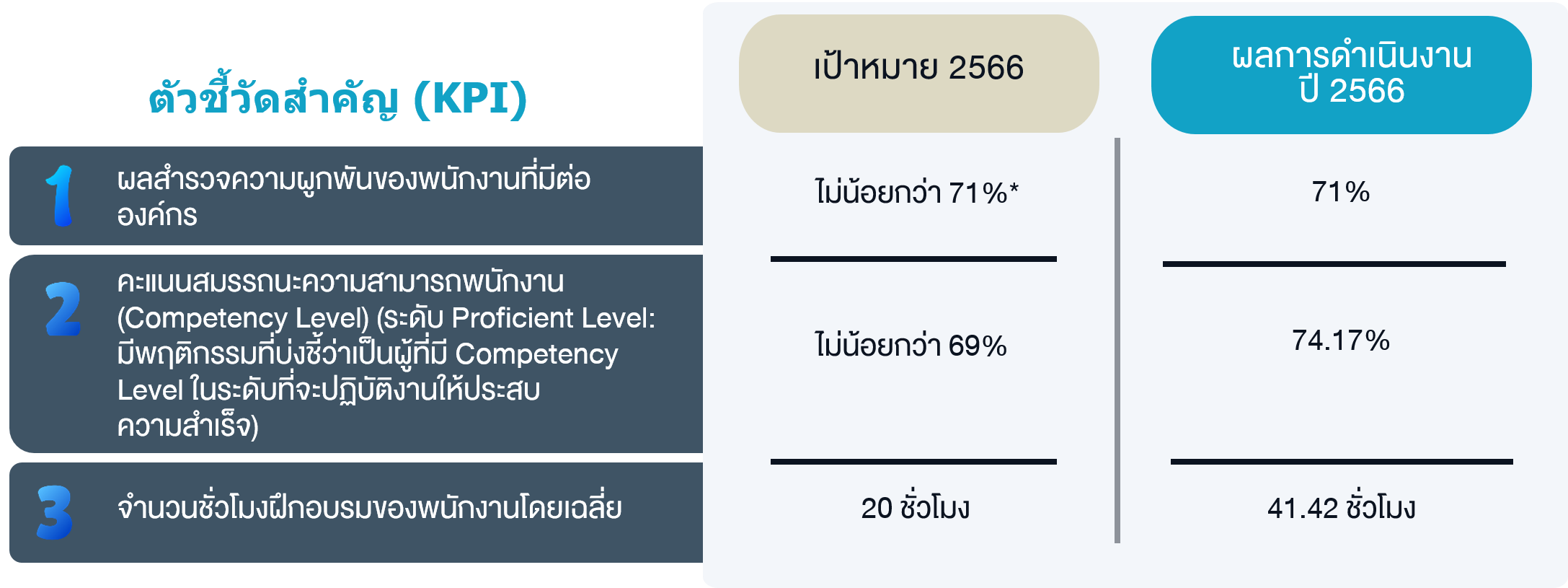ในปี 2566 อัตราการลาออกของพนักงานอยู่ที่ร้อยละ 1.68 อยู่ในระดับน้อยกว่าตลาดในอุตสาหกรรมเดียวกัน ในการสำรวจความผูกพันของพนักงานที่มีต่อองค์กร (Employee Engagement Survey) ประจำปี 2566 มีพนักงานที่เข้าร่วมการสำรวจความผูกพันของพนักงานที่มีต่อองค์กรคิดเป็นร้อยละ 90 ของพนักงานทั้งหมด และพบว่าพนักงานมีความผูกพันต่อองค์กรเท่ากับร้อยละ 71 โดยในปี 2566 องค์กรได้ดำเนินการตามแผนแนวทางการยกระดับความผูกพันของพนักงานต่อองค์กร เพื่อแก้ไขประเด็นปัญหาหลักตามผลการวิเคราะห์การสํารวจความผูกพันของพนักงานที่มีต่อองค์กรของปี 2565 ตัวอย่างเช่น ประเด็นเรื่องโครงสร้างพื้นฐานและทรัพยากร (สถานที่ทํางานและที่จอดรถ ระบบและเทคโนโลยีที่สนับสนุนการทํางาน)