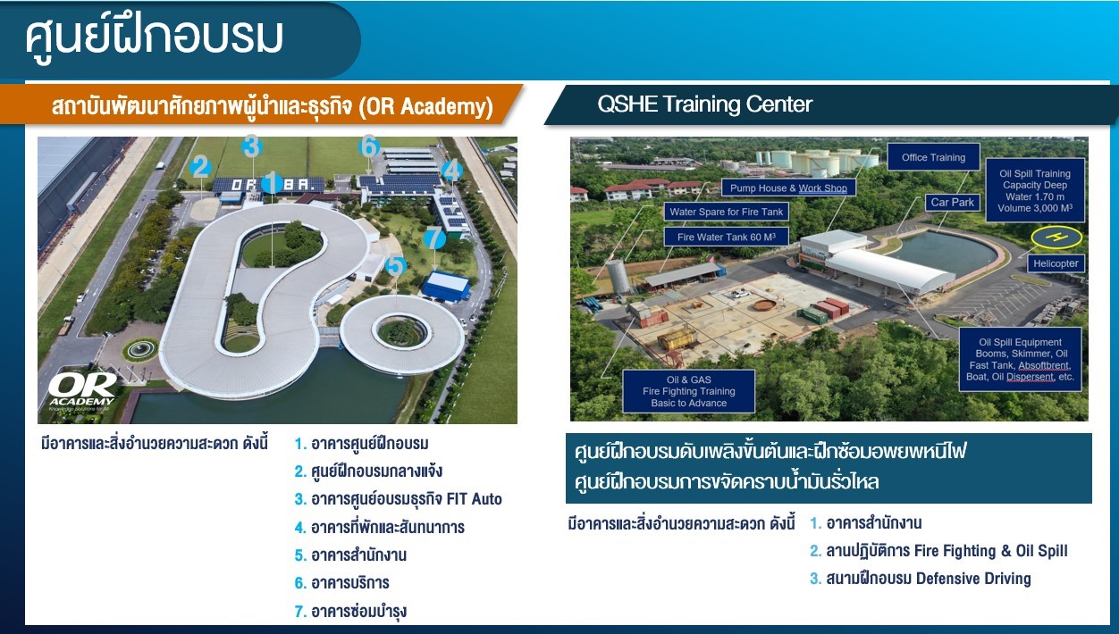 นอกจากนี้ฝ่ายสถาบันพัฒนาศักยภาพผู้นำและธุรกิจ รับผิดชอบการบริหารดำเนินงานศูนย์ฝึกอบรม 2 แห่ง ได้แก่ 1) ศูนย์ฝึกอบรม OR Academy วังน้อย จังหวัดพระนครศรีอยุธยา พร้อมสิ่งอำนวยความสะดวกประกอบด้วย ห้องฝึกอบรม ห้องประชุม อาคารที่พักพร้อมห้องเอนเตอร์เทนเม้นท์และออกกำลังกาย สนามฟุตบอล ห้องจำลองการเรียนรู้ (Simulation Room) ทั้งภายในและภายนอกอาคาร และ 2)ศูนย์ฝึกอบรมดับเพลิงขั้นต้นและฝึกซ้อมอพยพหนีไฟ ศุนย์ฝึกอบรมการขจัดคราบน้ำมันรั่วไหล ซึ่งเป็นศูนย์ฝึกอบรมเฉพาะทาง QSHE Training จ. สระบุรี สิ่งอำนวยความสะดวกประกอบด้วย อาคารสำนักงาน ห้องฝึกอบรม สนามฝึกดับเพลิง สนามฝึกอบรม Oil Spill สนามฝึก Defensive Driving รวมถึงต้อนรับการเข้าศึกษาดูงาน ตลอดจนกำหนดนโยบายและส่งเสริมสนับสนุนงาน KM ขององค์กร