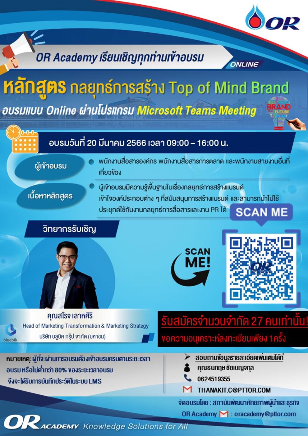 | การตลาด | กลยุทธ์การสร้าง Top of Mind Brand | เพื่อให้พนักงานในสายงานที่เกี่ยวข้องทราบถึงกลยุทธ์ แนวทางการสร้างสรรค์งานโฆษณาและงานประชาสัมพันธ์เพื่อสร้างแบรนด์ OR ให้เป็น Top of mind brand รวมถึงมีความรู้พื้นฐานในเรื่องกลยุทธ์การสร้างแบรนด์ เข้าใจองค์ประกอบต่าง ๆ ที่สนับสนุนการสร้างแบรนด์ และสามารถนำไปประยุกต์ใช้กับงานกลยุทธ์การสื่อสารและงาน PR ได้ | พนักงานได้มีมุมมองเกี่ยวกับ Top of mind brand ที่หลากหลายมากขึ้น จาก Case Study แบรนด์ต่าง ๆ ในหลักสูตร พนักงานสามารถนำความรู้มาประยุกต์ใช้ในการวางแผนการสื่อสาร และการโฆษณาประชาสัมพันธ์ให้แบรนด์ OR และ Product brands เป็น Top of mind brand ซึ่งค่าเฉลี่ยของผลคะแนนความพึงพอใจของพนักงานที่มีต่อการจัดอบรมหลักสูตรอยู่ที่ 94.78% | |