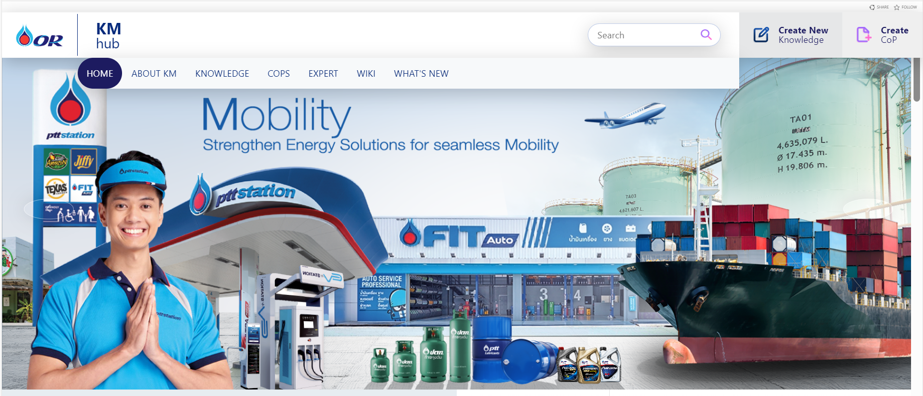 OR มีความมุ่งมั่นในการเป็น Innovative Learning Organization จึงพัฒนา KM Hub เพื่อเป็นศูนย์รวมองค์ความรู้แก่พนักงานภายใน OR เพื่อให้การจัดการองค์ความรู้ (Knowledge Management) ดำเนินไปอย่างมีประสิทธิภาพ โดยการประยุกต์ใช้เทคโนโลยีในการจัดเก็บองค์ความรู้ทั้งภายในและภายนอกองค์กรอย่างครบวงจร ตั้งแต่การระบุ บ่งชี้ประเภทขององค์ความรู้ที่สำคัญ เพื่อเผยแพร่ ถ่ายโอน แลกเปลี่ยน และเกิดการนำไปใช้ประโยชน์ ให้บุคลกรของ OR สามารถนำองค์ความรู้ไปประยุกต์ใช้ในสถานการณ์ต่าง ๆ ได้อย่างทันเหตุการณ์ ซึ่งจะส่งผลให้การปฏิบัติงานภายในองค์กรดำเนินไปอย่างมีประสิทธิภาพ