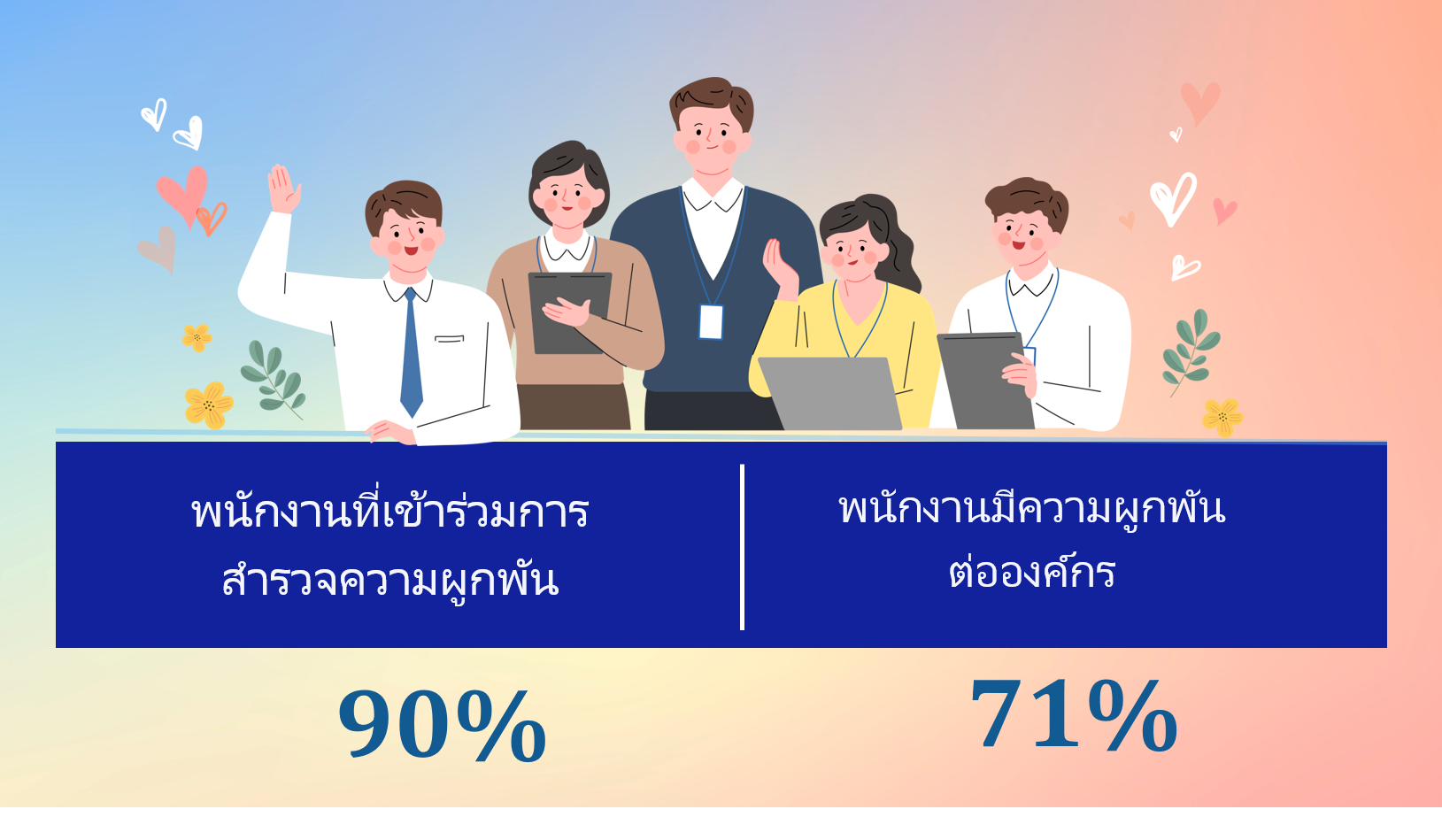 ทั้งนี้ OR ได้ดำเนินการวิเคราะห์ผลการสำรวจความผูกพันของพนักงานที่มีต่อองค์กรในปี 2566 พบว่า ปัจจัยด้านผู้บริหารระดับสูง ปัจจัยด้านความสมดุลในชีวิต และปัจจัยด้านโครงสร้างพื้นฐานและทรัพยากร เป็น 3 ปัจจัยหลักที่ควรมุ่งเน้นในการพัฒนา โดยมีการนำเสนอที่ประชุมคณะกรรมการจัดการทรัพยากรบุคคล (HRMC) รับทราบผลการสำรวจและพิจารณาอนุมัติแผนแนวทางการยกระดับความผูกพันของพนักงานต่อองค์กรในภาพรวมของ OR ตัวอย่างเช่น การกำหนดให้ผู้บริหารระดับสูงมีการสื่อสารทิศทางกลยุทธ์การดำเนินงานและเป้าหมายทางธุรกิจให้พนักงานรับทราบอย่างสม่ำเสมอ เพื่อให้พนักงานมีความมั่นใจในการเตรียมความพร้อมต่อการเปลี่ยนแปลงทางธุรกิจของ OR และการเพิ่มความคล่องตัวในการทำงานนอกสถานที่ผ่านนโยบาย Work from Anywhere รวมถึงการจัดสรรพื้นที่ทำงานในสำนักงานให้มีประสิทธิภาพ เช่น Co-Working Space เป็นต้น เพื่อยกระดับความผูกพันของพนักงานต่อองค์กรให้เพิ่มขึ้นในปี 2567 ต่อไป นอกจากนี้ มีการสื่อสารผลการสำรวจความผูกพันของพนักงานที่มีต่อองค์กรของแต่ละสายงานให้ผู้บริหารได้รับทราบผลการสำรวจและดำเนินการแก้ไขประเด็นปัญหาที่เกิดขึ้นตามบริบทสายงาน เพิ่มเติมจากการดำเนินงานตามแผนแนวทางการยกระดับความผูกพันของพนักงานต่อองค์กรในภาพรวมของ OR