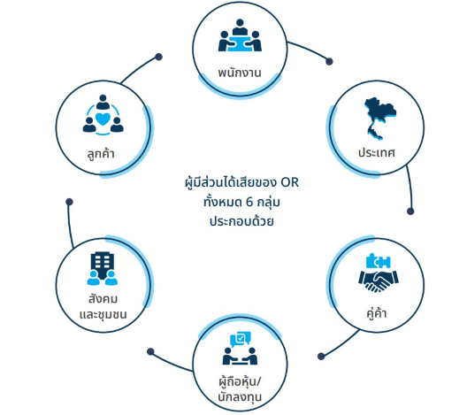 • ผู้ถือหุ้น/นักลงทุน: ผู้ถือหุ้น นักลงทุน นิติบุคคล และสถาบันที่ลงทุนในตลาดหลักทรัพย์ • พนักงาน: พนักงานโออาร์ และพนักงานที่ว่าจ้างผ่านบริษัทภายนอกที่อยู่ภายใต้การกำกับดูแลของโออาร์ • คู่ค้า: บริษัทร่วมกิจการค้า พันธมิตรทางธุรกิจ ผู้ส่งมอบสินค้าและบริการ และผู้รับเหมา • ลูกค้า: ตัวแทนจำหน่าย ผู้ที่ได้รับสิทธิในการประกอบธุรกิจ และผู้บริโภค • สังคมและชุมชน: ผู้ที่อาจได้รับผลกระทบจากการดำเนินธุรกิจ |