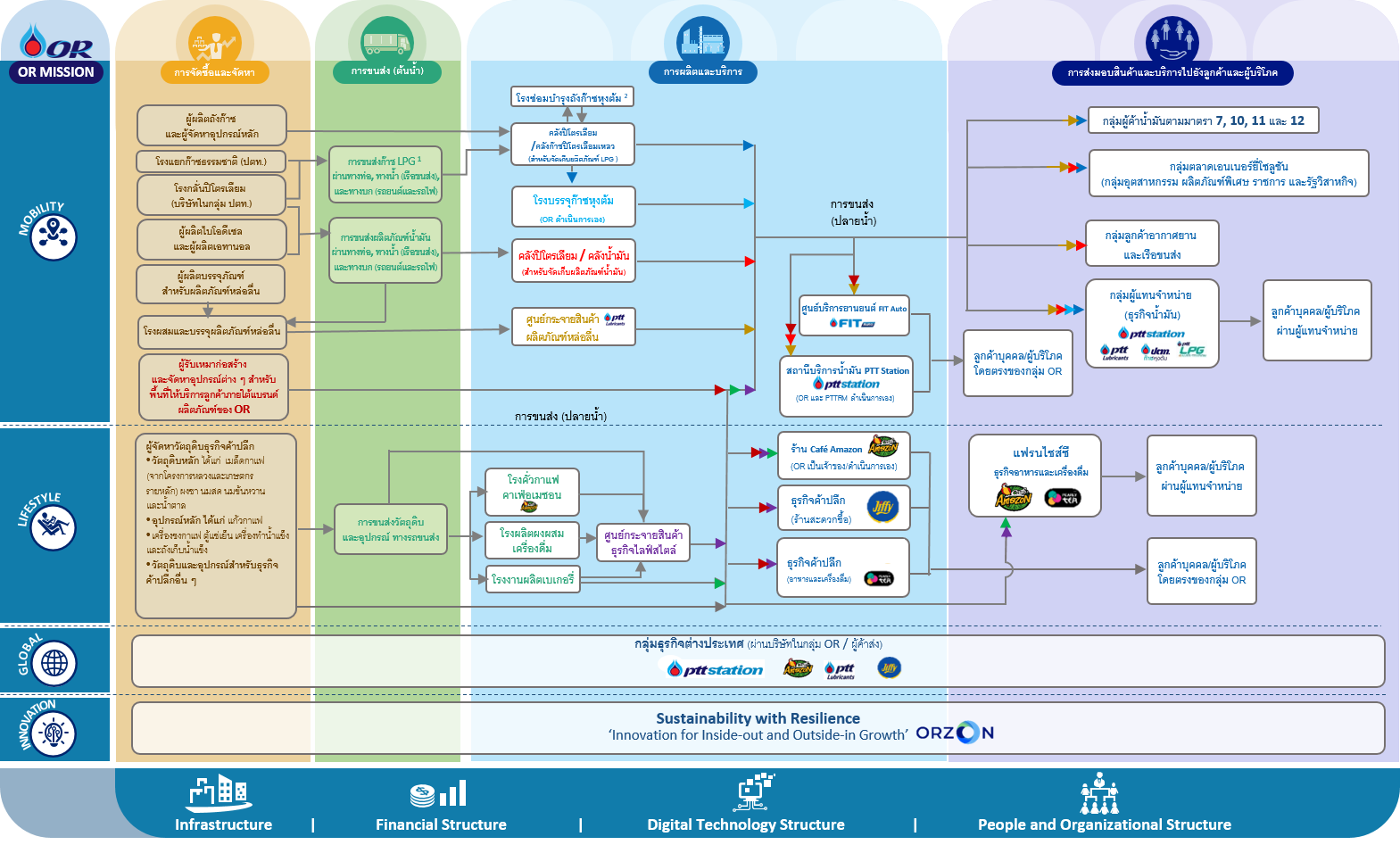OR มีโครงสร้างการดำเนินธุรกิจแบ่งออกเป็นธุรกิจหลัก 4 กลุ่ม ได้แก่ กลุ่มธุรกิจ Mobility กลุ่มธุรกิจ Lifestyle กลุ่มธุรกิจ Global และกลุ่มธุรกิจ OR Innovation โดยมีกิจกรรมในกลุ่มธุรกิจ Mobility คือ การจัดจำหน่ายผลิตภัณฑ์ปิโตรเลียมผ่านการตลาดค้าปลีก ธุรกิจเอนเนอร์ยี่โซลูชั่น และธุรกิจหล่อลื่น มีผลิตภัณฑ์หลัก ได้แก่ น้ำมันเบนซิน น้ำมันดีเซล ก๊าซปิโตรเลียมเหลว (LPG) เชื้อเพลิงอากาศยาน น้ำมันเตาสำหรับเรือขนส่งและภาคอุตสาหกรรม และผลิตภัณฑ์หล่อลื่น สำหรับกลุ่มธุรกิจ Lifestyle ได้แก่ ธุรกิจร้านกาแฟ ร้านสะดวกซื้อ ร้านค้าปลีก อาหารและเครื่องดื่ม รวมถึงธุรกิจการบริหารจัดการพื้นที่ในสถานีบริการน้ำมัน และกลุ่มธุรกิจ Global ได้ดำเนินการทั้งธุรกิจ Mobility และธุรกิจ Lifestyle ผ่านบริษัทย่อยซึ่งจัดตั้งในต่างประเทศ อีกทั้ง OR ได้มีการจัดตั้งธุรกิจ ได้แก่ ORZON Venture เพื่อแสวงหาโอกาสการลงทุนในบริษัทสตาร์ทอัพด้าน Mobility และ Lifestyle ที่มีศักยภาพทั้งในประเทศไทยและต่างประเทศ นอกจากนี้ ยังมีกลุ่มงานสนับสนุนการดำเนินธุรกิจหลักของ OR ประกอบด้วย พื้นที่ปฏิบัติงานสนับสนุน เช่น สถาบันพัฒนาศักยภาพผู้นำและธุรกิจ (OR Academy) ศูนย์ธุรกิจไลฟ์สไตล์ (OASYS) โครงสร้างสนันสนุนทางการเงิน โครงสร้างสนับสนุนด้านเทคโนโลยีดิจิตอล และโครงสร้างสนับสนุนด้านบุคลากรและศักยภาพองค์กร โดยแต่ละกิจกรรมมีความสัมพันธ์กับผู้มีส่วนได้เสียหลักของ OR ทั้ง 6 กลุ่ม ดังนี้